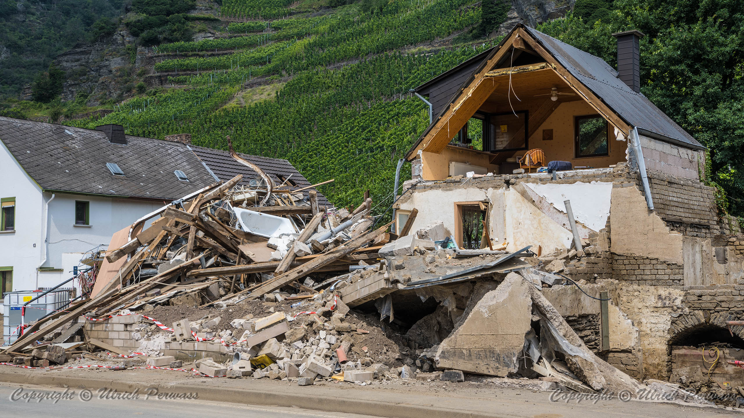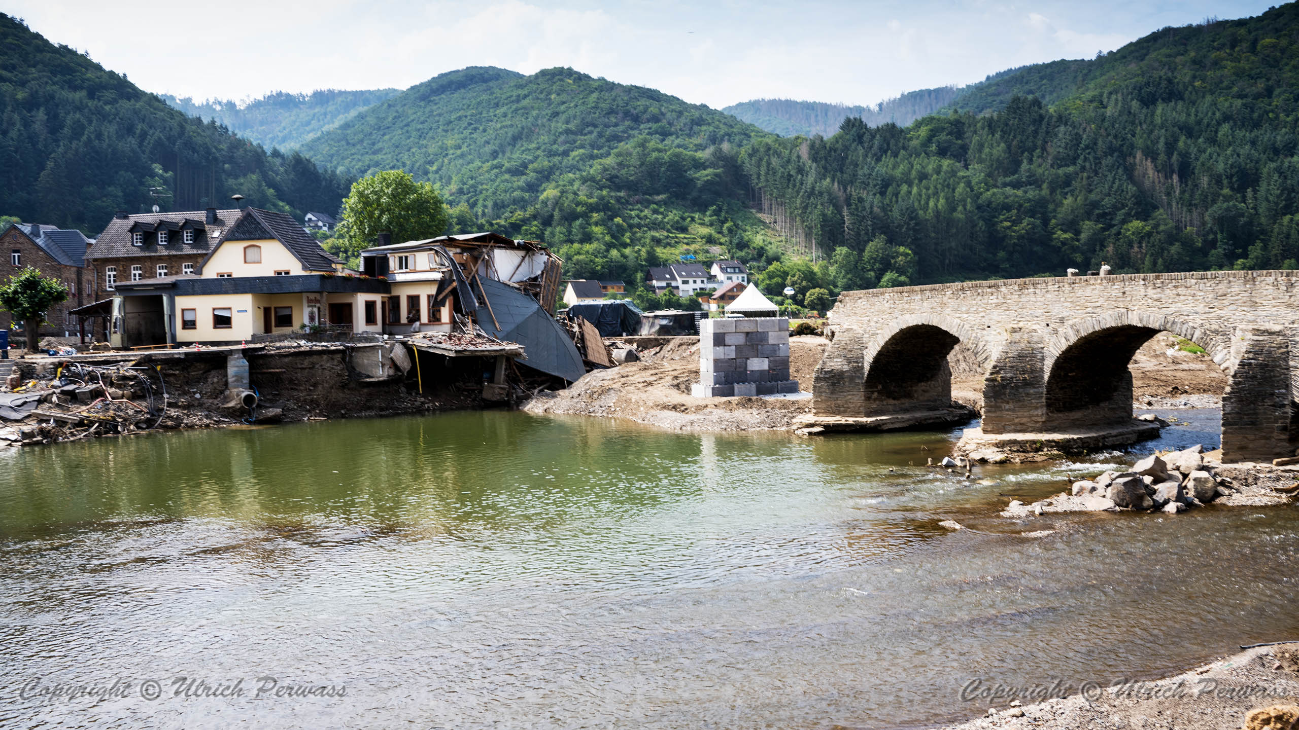Hochwasserflut an der Ahr Vom 14. zum 15. Juli 2021 regnete es über der Eifel so heftig, dass eine über 8 Meter hohe Flutwelle das Ahrtal durchrauschte und den größten Teil der Infrastruktur, die Wasser- und Stromversorgung und viele, viele Häuser zerstörte. 141 Menschen ertranken in den Fluten, Hunderte wurden verletzt und Tausende verloren ihr Heim und ihr Hab und Gut! Da ich in den letzten 40 Jahren häufiger den Radweg des Ahrtals von Kripp am Rhein bis Schuld in der Eifel entlang geradelt bin, trieb es mich jetzt am 13. und 14. August wieder dahin, um mir einen Überblick über die Katastrophe zu verschaffen. Radweg und Eisenbahnverbindung werden auf Jahre hinaus nicht mehr zu benutzen sein! Schauen Sie selbst und spenden Sie anschließend aus vollem Herzen für den Wiederaufbau! Folge 1 Von Dernau bis Altenahr
