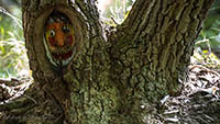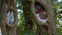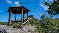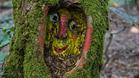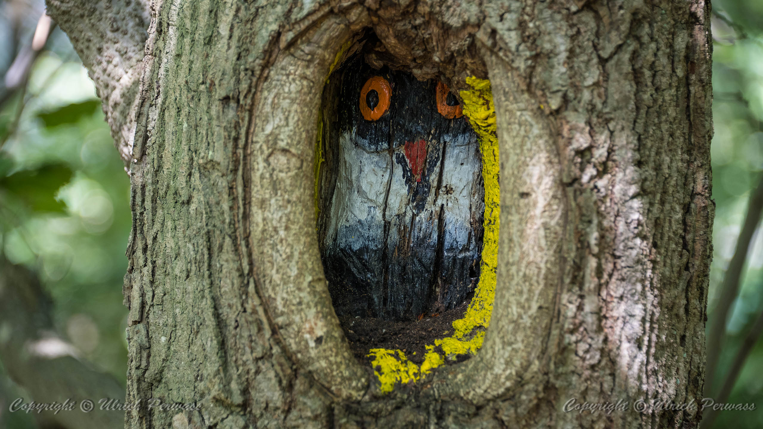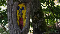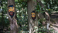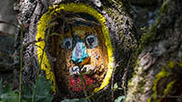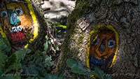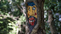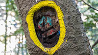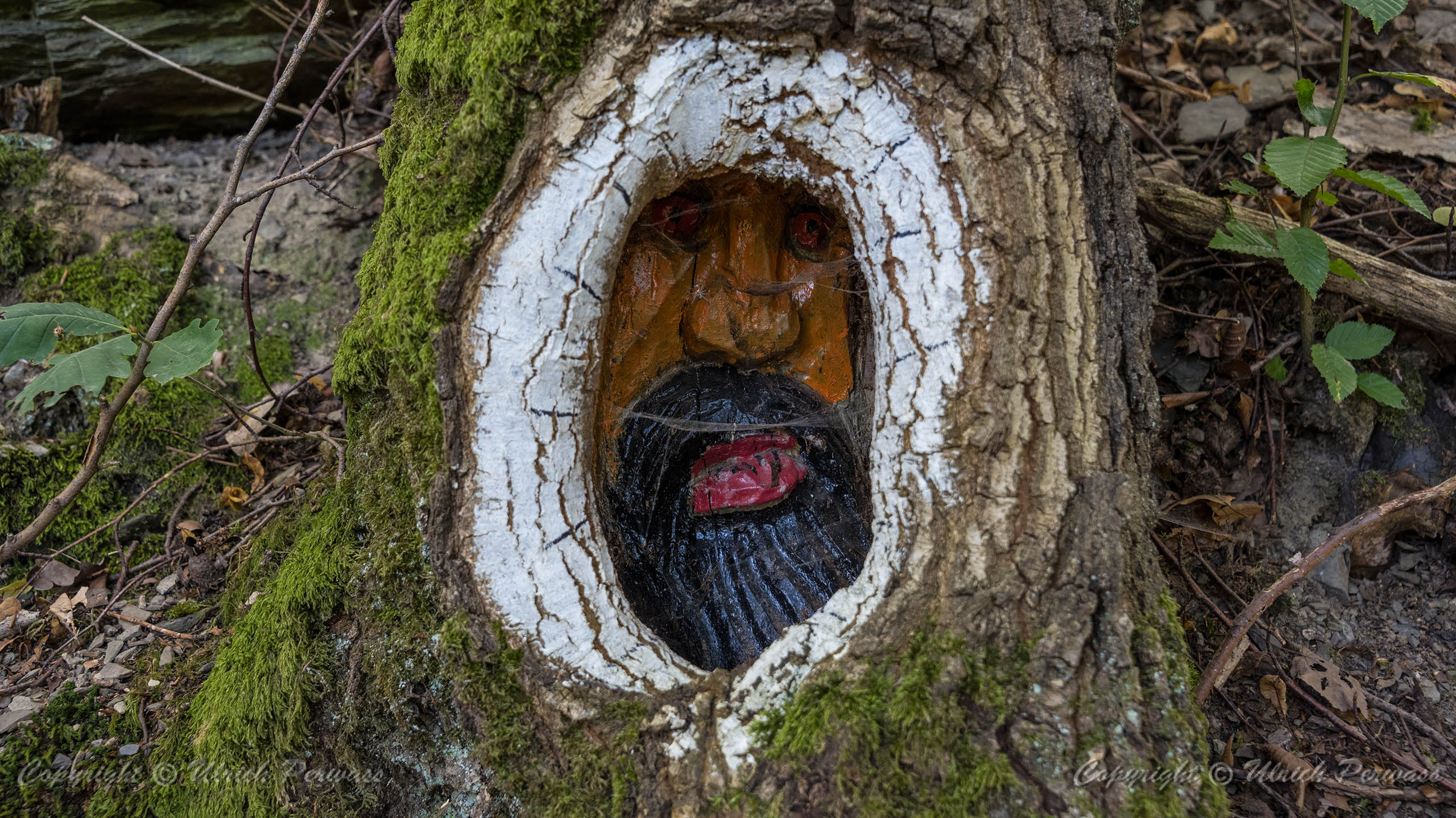 Diesen geschichtlichen Hintergrund erweitert ein ortsansässiger Künstler seit Jahren durch die Erweckung der Baumgeister am Wanderweg zum Schwarzen Kreuz und Teufelsloch. Wandern Sie mit! Direkt hinter dem Bahnhof klettern Sie steil bergan bis zu einem Aussichtspavillon. Sanfter geht es in der Nähe von der z.Zt. zerstörten Eisenbahnbrücke an der B 267 (Bild 01) nach oben. |