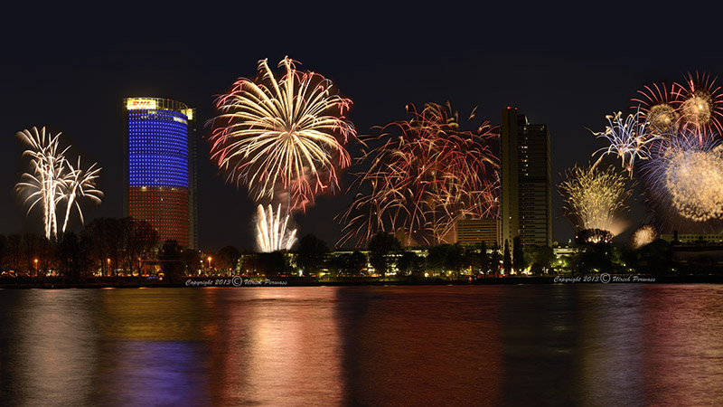 Das alljährliche Feuerwerk "Rhein in Flammen" in Bonn ist immer wieder eine Reise wert. Diesmal also am 4. Mai 2013. Das Wetter war gut, kein Regen in Aussicht und der Wind blies rheinaufwärts, so dass die Rauchwolken der Feuerwerksraketen das Kunstwerk der Firma Weco aus Eitorf nicht verdecken konnten. Die Inszenierung des Feuerwerks war wirklich ein Kunstwerk, ein Kunstwerk rythmisch-visueller Impressionen, die das Publikum zu spontanem AH! und OH! und langem Beifall am Ende herausforderten. Meine Bilder können in der dargestellten Fotomontage sicher nur einen kleinen Eindruck dieses Ereignisses wiedergeben. Trotzdem wünsche ich Ihnen ein paar Minuten guter Unterhaltung! Die beiden Hochhäuser sind übrigens der Post-Tower (DHL) und der "Lange Eugen", das einstige Abgeordnetenhochhaus, das so im Volksmund nach dem ehemaligen Bundestagspräsidenten Eugen Gerstenmaier (1906 - 1986) genannt wird. Mit einer Amtszeit von 14 Jahren, 2 Monaten und 15 Tagen (1954 - 1969) war Gerstenmaier der am längsten amtierende Bundestagspräsident. Und wie immer bei meinen Panoramen haben Sie die beste Sicht in der Vollfensterdarstellung, die Sie mit dem rechten Hotspot am unteren Bildrand erreichen. Start mit Klick auf das nachstehende Bild. Zurück mit Alt+Links  |