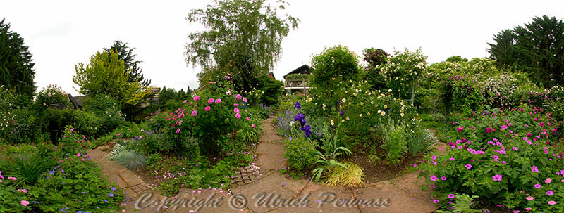 Mai, Juni! Zeit der überquellenden Fruchtbarkeit, Zeit der Gärten, Zeit der Rosengärten! Hier nun Heides Rosengarten in der Eifel als Panorama! Leider war der Himmel bedeckt, als ich dieses Panorama machen durfte. Aber was soll's. Drehen wir uns langsam im Kreise und erinnern wir uns an das geschäftige Summen der Bienen und Hummeln, an den berauschenden Duft, an die besinnlichen Stunden im Teehaus unter einer hoch hinaufquellenden Wolke zartrosa Blüten. Ein Traum, ein Traum für das ganze Jahr!
