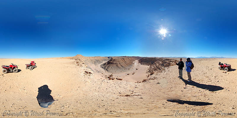 El Gouna, das ägyptische Ferienparadies am Roten Meer für gehobene Ansprüche, liegt etwa 20 km nördlich von Hurghada. Es hat einen 10 km langen Strand mit feinstem Sand. Das kristallklare, türkise Wasser, der ganzjährige Sonnenschein und eine Vielzahl von Sportarten und Freizeitbeschäftigungen überzeugen auch den anspruchsvollsten Touristen. Samih Sawiris, ein ägyptischer Geschäftsmann, ist der Initiator dieses Feriengebietes. Das Panorama zeigt den Color Canyon, der freihändig von Christian Perwass auf einer Quad-Bike Tour aufgenommen wurde. Hier sehen Sie den Color Canyon vom Satelliten aus in Google Maps. |