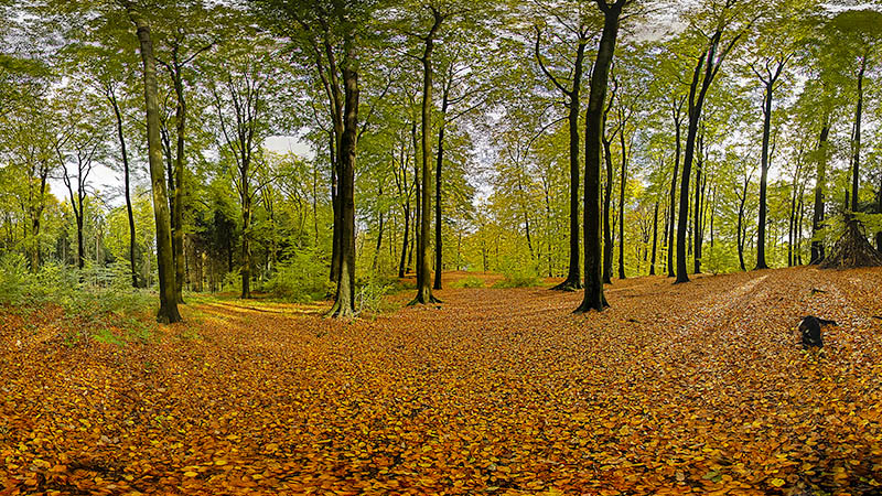 Durch diesen Laubwald streiften schon vor der Zeitenwende unbekannte Stämme auf der Suche nach Nahrung und Siedlungsraum. Hier in unmittelbarer Nähe des heutigen Ortes Moitzfeld bei Köln errichteten sie eine schützende "Erdenburg", von der heute nach den letzten Ausgrabungen wieder einige Gräben zu sehen sind. Mich faszinierte die herbstliche Farbenpracht, die ich im folgenden Panorama einzufangen versuchte. Unsere Hündin Lubina wartete geduldig, bis die 30 Aufnahmen im Kasten waren.