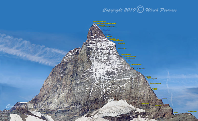 Dieses Panorama Matterhorn-Ostwand soll den Matterhorn-Aufstieg über den Hörnligrat vom Einstieg bei der Hörnlihütte bis zum Schweitzer Gipfel in voller Länge zeigen. Der Aufstieg erfolgt mehr oder weniger ganz knapp unterhalb des Grates. Eine Markierungslinie würde die interessanten Stellen verdecken. Deshalb werden nur die Bezeichnungen einiger Orientierungspunkte gezeigt.