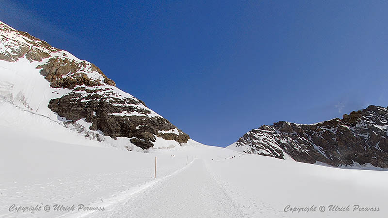 Von der Sphinx-Halle tief im Innern des Jungfraujochs geht es hinaus auf den Gletscher zum Mönchsjoch und der herrlich gelegenen Mönchsjochhütte auf 3657m Höhe. Es sind zwar nur 203m aufzusteigen, aber in dieser Höhe direkt am ersten Tag des Alpenurlaubs unangepasst wandern zu wollen kostet etwas Überwindung. Ich habe es nicht bereut, wie Sie sicher mir zustimmen werden, wenn Sie das folgende Panorama gesehen haben.