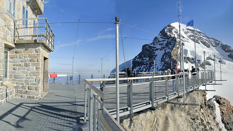 "Glück muss der Mensch haben!" Ich hatte Glück! Morgens um 6.30 Uhr aufgestanden, dann schnell ohne Frühstück zur Bahnstation der Jungfraubahn in Grindelwald, um mit dem ersten Zug hinauf zum Jungfernjoch zu zahnen! Sie haben richtig gelesen: zu zahnen! Die Schweitzer durchlöchern nicht nur ihren Käse, nein sie durchlöchern auch ihre Alpen wie ihren Käse und wenn es zu steil wird, dann verpassen sie den Löchern Zähne, mit denen sich ihre Eisenbahnen hochbeissen können. So also ging es von 1034m in Grindelwald hinauf bis zum Jungfraujoch auf 3454m. Unterwegs wurde in der Eigernordwand auf 2865m für fünf Minuten Halt gemacht, um den erschauernden Touristen die "Mordwand" der Alpen zu zeigen. Zum Abschluss noch eine Expressliftfahrt hinauf zum Sphinx-Observatorium auf 3571m Höhe. Oben angekommen war mein Glück vollkommen. Herrlichstes Wetter, klare Sicht und nicht allzu viele Touristen, die den Blick auf das weit ausladende Panorama auf Mönch, Jungfraufirn, Großer Aletschgletscher und Jungfrau verstellen konnten. Nur einige Frühaufsteher aus Japan waren hier. Doch schauen Sie selbst: