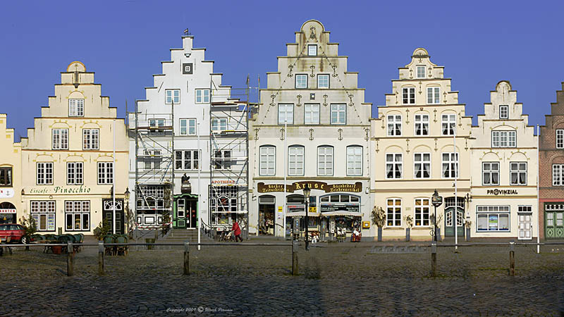 Eine geschlossene Front holländischer Kaufmannshäuser aus der Gründungszeit prägt die Westseite des Marktes dieser Holländerstadt in Schleswig-Holstein.