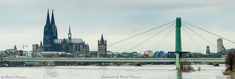 Tagelange Regenfälle haben Mitte Januar 2011 den überaus schneereichen Winter abrupt beendet. Die Folge war Hochwasser am Rhein und seinen Zuflüssen. Das nachstehende Panorama zeigt das Hochwasser in Köln von der Südbrücke aus gesehen. Leider ist der nördliche Gehweg zur Zeit wegen Bauarbeiten gesperrt, so dass das Panorama vom südlichen Gehweg aus erstellt werden musste. Doch deutlich kann man die wegen des Hochwassers festliegenden Schiffe vor den Kranhäusern am Rheinauhafen erkennen. Die sonst so hohe Kaimauer ist im Wasser verschwunden. Im nördlichsten Kranhaus wohnt übrigens ganz, ganz oben, dem Himmel und Dom so nahe, ein überaus beliebter Torschütze des 1. FC Köln, der am Tag der Aufnahme dieser Bilder das Tor zum Unentschieden beisteuerte! Herzlichen Glückwunsch!