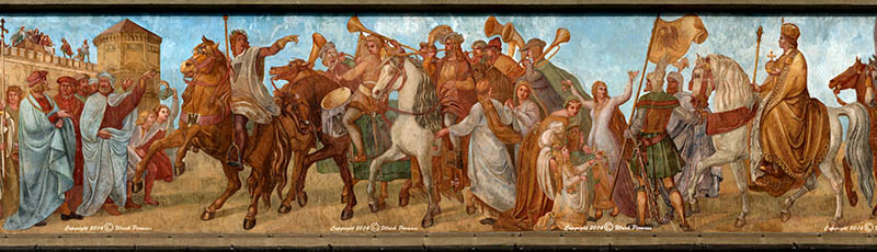 Das 75 x 8 Fuß große Wandfresko (22,86 x 2,44 m) entwarf Bernhard Neher d.J. nach einer Zeichnung von Peter Cornelius. 1835 setzte er es zusammen mit Clemens Kögl in die Tat um. 1881 wurde das stark verwitterte Werk von Paul Wagner und Boss erneuert.