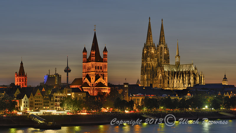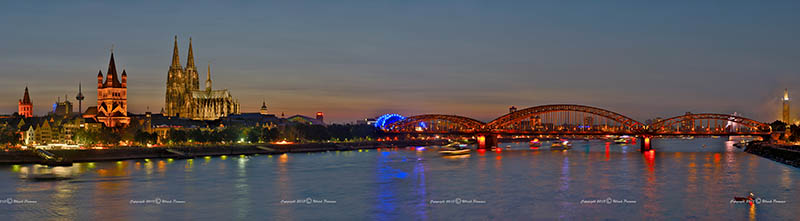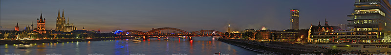 Sven Plöger, der Wetterfrosch im WDR, hatte es versprochen und so geschah es auch. Erst um halb neun abends belegte ich einen guten Platz mit herrlicher Panoramasicht auf die Altstadt und den Dom auf der Deutzer Brücke (N 50° 56.198', E 6° 58.038'). Ich hatte genug Zeit, mein Stativ samt Kamera aufzubauen und mich auf das kommende Ereignis vorzubereiten und mit den Nachbarn Kontakte zu knüpfen. Grüße aus Oberhausen und Wuppertal soll ich bestellen! Hier nun das Rheinpanorama kurz vor dem Feuerwerk! Die Vollfensterdarstellung erhalten Sie durch Klick auf den rechten Hotspot unten rechts im Bild.