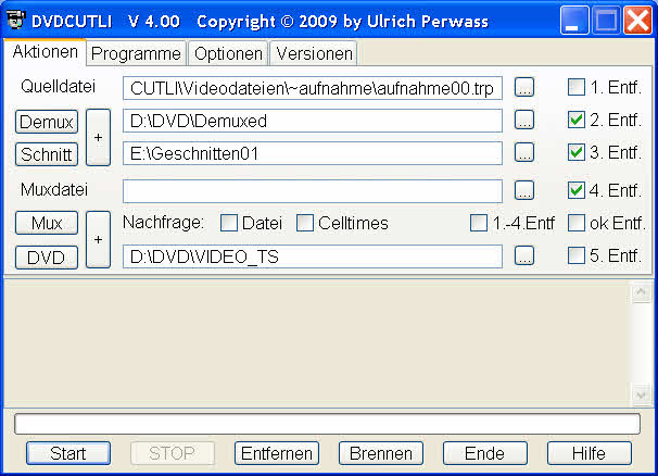 Hierbei ist für jede Aufgabe ein spezielles Programm erforderlich. Das Demuxen wird mit ProjectX, das Schneiden mit Mpeg2Schnitt und das Authoren mit IfoEdit durchgeführt. Diese Programme sind im Internet zu finden und können von dort kostenlos heruntergeladen werden. Zum abschließenden Brennen einer DVD können Sie ihr vertrautes Brennprogramm nutzen.