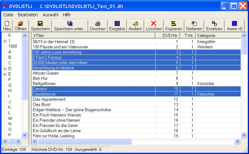 Ganz schön aufwendig dieses Ausdrucken, wenn Sie nach Eingabe von 10 neuen Filmen die ganze Liste mit 635 Einträgen erneut ausdrucken müssen! DVDLISTLI hilft Ihnen auch dort. Sortieren Sie die Liste absteigend nach DVD-Nummern, machen Sie nun eine Auswahl mit den zuletzt eingegebenen Filmen mit den höchsten DVD-Nummern und sortieren Sie anschließend wieder aufsteigend nach Filmtiteln. Die Auswahl bleibt bei der Neusortierung erhalten. Diese können Sie nun auf einem einzigen Blatt Papier ausdrucken und als Anhang an die alte Filmliste heften, bis es sich wieder lohnt, die gesamte Filmliste erneut zu drucken.