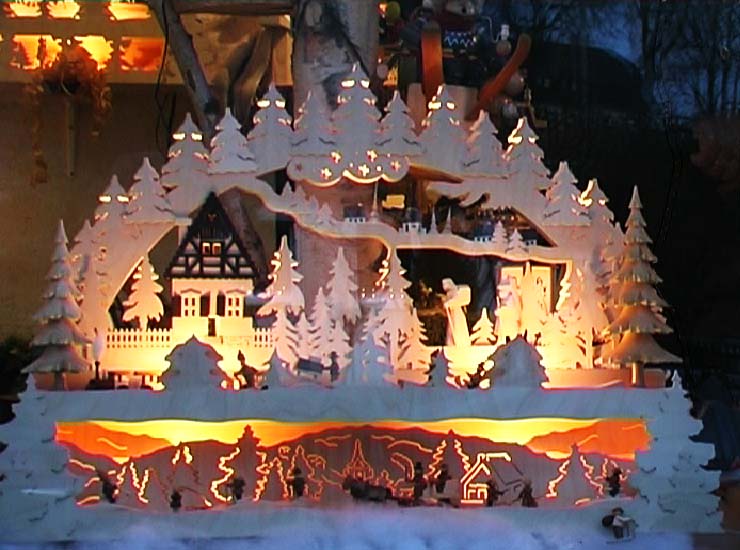 Weihnachten im Erzgbirge! Das hatte ich mir schon vor Jahren im Sommer vorgenommen, als ich das erste Mal in Seiffen war und und mir eine tief verschneite Dorfstraße vorstellte, festlich beleuchtet von trauter Weihnachtsdekoration, emsig bevölkert mit dick vermummten Kindern mit leuchtenden Augen vor den strahlenden Auslagen der Schnitzwerkstätten, belebt mit fröhlichen Erwachsenen an den Glühweinständen, die das heiße Getränk die Sinne belebend in sich hineinschlürfend an ihre Kindheit erinnert werden und all das untermalt vom Posaunenchor hoch oben auf dem Marktplatz unterhalb der Kirche. Friedvolle Welt! Heile Welt! Nun dieses Jahr hat es geklappt. Zwar fehlte der Schnee, doch alles andere war, so wie ich es mir vorgestellt hatte. Nur mit der Unterkunft haperte es in Seiffen. Ich war zu spät dran. Eine freundliche Stimme am Telefon des Fremdenverkehrsvereins empfahl mir das Schützenhaus in Zöblitz. Wie sich herausstellte ein guter Rat. Zöblitz liegt zwar ca. 23km von Seiffen entfernt, doch dafür zentral zu vielen anderen Sehenswürdigkeiten im Erzgebirge wie etwa Annaberg-Buchholz, Oberwiesenthal, Schloß Augustusburg, Chemnitz, Greifensteine. Außerdem ist das Schützenhaus und damit Zöblitz mindestens seit dem Jahre 1813 berühmt für seine außerordentliche Gastlichkeit. Damals rasteten dort 30 000 Mann, als es gegen den kleinen Korsen vor Dresden gehen sollte. Sie wären, so geht die Mär, beinahe zu spät zum Sieg gekommen, weil sie in Zöblitz so gut bewirtet worden waren, dass sie sich nicht trennen mochten. |