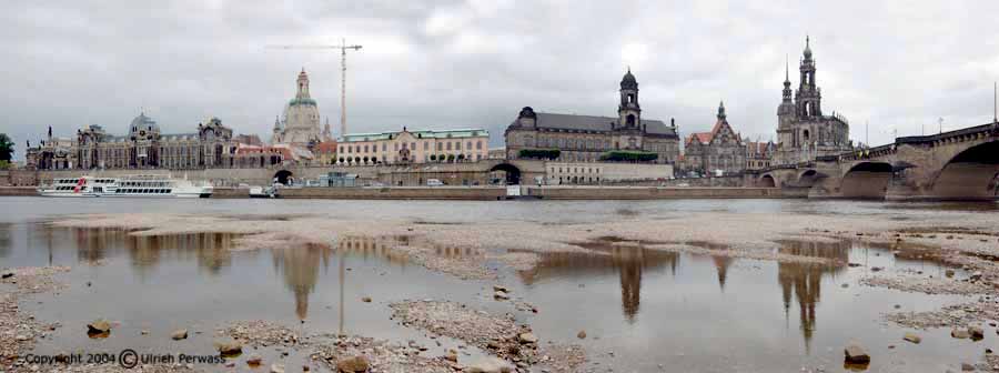 13. Juli 2004: "Stark bewölkt, zeitweise Regen". So tönt es aus dem Autoradio. Soll ich, soll ich nicht? Ich wagte es und machte auf meinem Weg auf der A4 nach Osten einen kurzen Abstecher ins barocke Dresden. Schließlich hatte ich meine neue Nikon D70 bei mir. Mit ihr wollte ich die Panoramaaufnahme des Fürstenzuges unbedingt wiederholen, da diese mit der Videokamera Canon XM1 ein Jahr zuvor nicht ganz zu meiner Zufriedenheit ausgefallen war. Für den Fürstenzug war der bedeckte Himmel und damit die gleichmäßige Ausleuchtung ideal, für den berühmten Canalettoblick auf Kathedrale und Augustusbrücke wäre etwas Sonne sicher besser gewesen. Die Aufnahmen des Fürstenzuges und des Canalettoblickes finden Sie auf den Panoramaseiten.