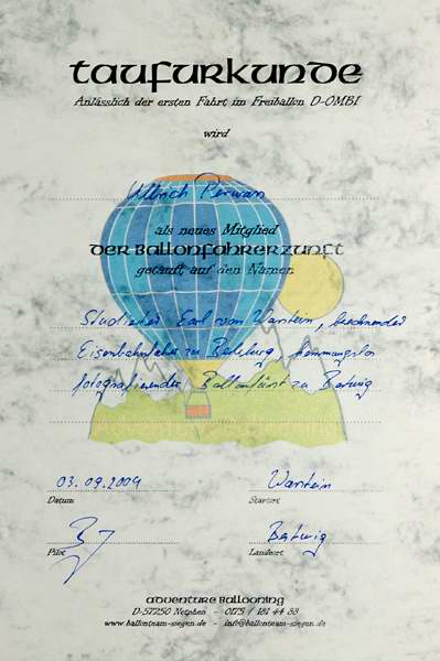 Ich schaffte es, fand sogar einen netten Piloten, der mich und meine schwere Fotoausrüstung mitnahm und mich dann abends nach meinem ersten Flug, Verzeihung, nach der ersten Fahrt mit einem Heißluftballon, so wie das so Ballonfahrertradition ist, taufend in den Adelsstand erhob: