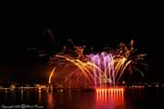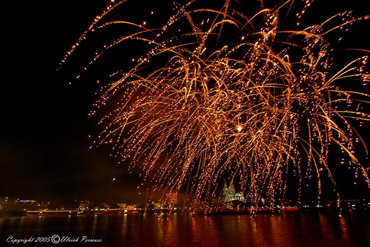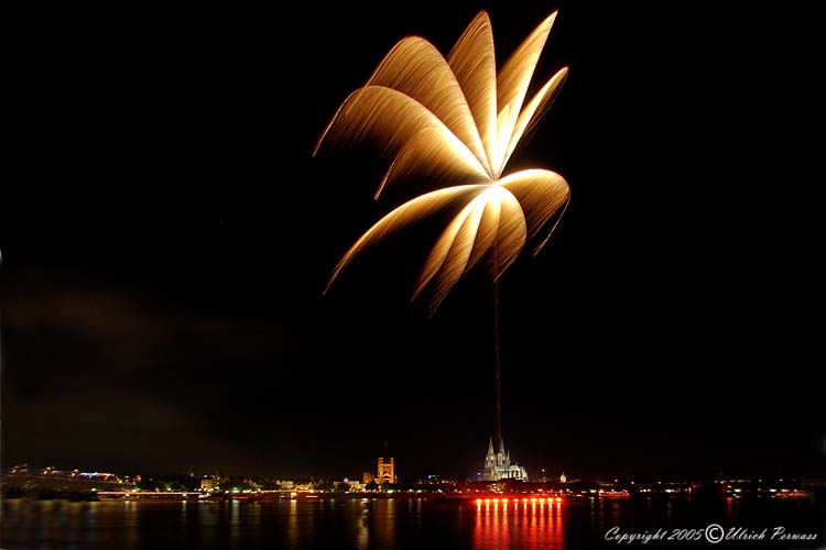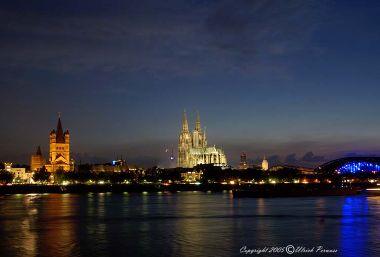 Mir schien es, als wäre ganz Köln, und das sind immerhin über 1 Million Einwohner, am Samstag, den 9. Juli 2005 unterwegs gewesen, um ein aussergewöhnliches Feuerwerk, die Kölner Lichter, zu erleben und feuchtfröhlich mit Grillwurst und Kölsch zu feiern. Die Stimmung war also, wie in Köln auch nicht anders zu erwarten, heiter, ausgelassen, sangesfreudig und heimatverbunden. Ich war schon um 17 Uhr angereist, um ein passendes Plätzchen für mein Stativ und mich gegenüber Groß St. Martin zu ergattern. Ein Rosenstrauch zur Linken und eine nette Party zur Rechten bewahrten mich vor dem Gedränge der Massen, die kontinuierlich bis 23.36 Uhr hinter und neben mir zur feuchtfröhlichen Freiluftparty aufliefen.