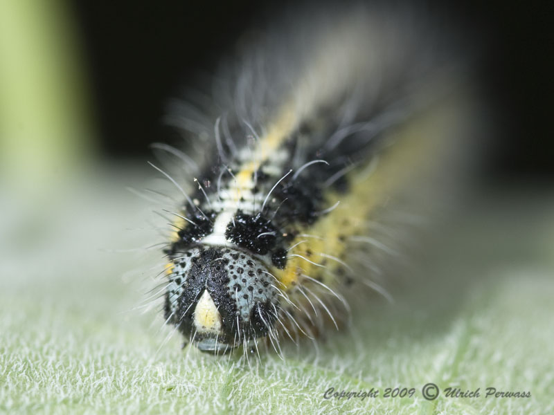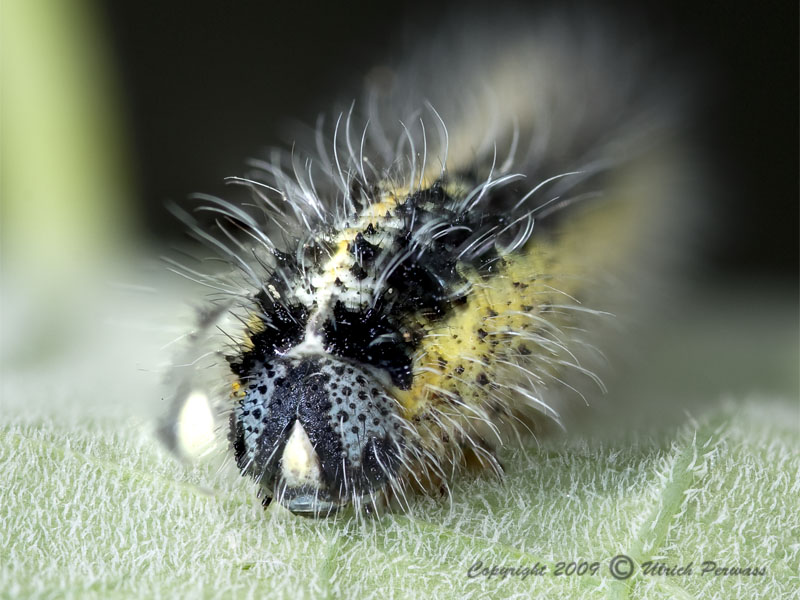 Im Internet gefunden: Refokussierung von Makroaufnahmen Darauf habe ich schon lange gewartet. Bisher musste man zur Vergrößerung des Bereiches der Schärfentiefe bei Makroaufnahmen viele Bilder mit aufeinanderfolgenden Schärfenebenen aufnehmen, die anschließend langwierig in Photoshop ineinander kopiert werden mussten. Die innovative Firma RAYTRIX GmbH aus Flintbek bei Kiel will ab November eine Kamera herausbringen, mit der es möglich sein soll, Aufnahmen mit Tiefeninformation zu erstellen, so dass durch die mitgelieferte Software jede gewünschte Schärfenebene nachträglich aus den Aufnahmedaten errechnet werden kann. Ebenso sind alle Schärfenebenen in einem einzigen Bild darstellbar. Selbst die nachträgliche Berechnung von 3D-Aufnahmen soll möglich sein. Der besondere Clou ist, dass alle Schärfenebenen zur selben Zeit (bewegte Objekte!) mit kameraüblichen Geschwindigkeiten erfasst werden und die nachfolgende Bildberechnung mit äußerst hoher Verarbeitungsgeschwindigkeit im Millisekundenbereich erfolgt, so dass dieses Verfahren sich ausgezeichnet für den industriellen Einsatz, zum Beispiel in der Qualitätssicherung, eignet. Lassen wir uns überraschen! Nachfolgend zwei eigene Beispielbilder der herkömmlichen Art. Das obere Bild zeigt die erste von insgesamt sieben Schärfenebenen. Das untere Bild ist die mit Photoshop erstellte Kombination aus allen von mir einzeln aufgenommenen Schärfenebenen. Dabei hatte sich die Raupe leider etwas bewegt. Der Blitz störte sie offensichtlich.