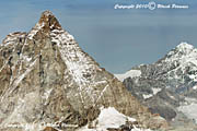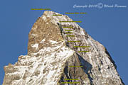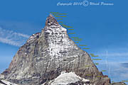 Die folgenden Panoramen zeige ich Ihnen, weil es mich als Amateurfotografen reizte, die Aufstiegsroute mit möglichst großer Auflösung auf meiner Homepage darzustellen. Doch ich muss Sie eindringlich warnen! Dies sind keine verlässliche Darstellungen für Bergsteiger, die ein Hilfsmittel für die Planung eines Aufstiegs auf das Matterhorn über den Hörnligrat suchen. Alle Angaben sind zwar der mir zugänglichen Literatur entnommen, aber doch sehr frei in das Bild eingesetzt worden. Für fachmännische Hinweise, die eine Korrektur zur Folge hätten, bin ich jederzeit dankbar. Über die Gefährlichkeit eines Aufstiegs auf das Matterhorn mit bisher etwa 600 Toten brauche ich hier wohl nicht zu philosophieren. Das haben kompetente Bergsteiger bereits getan: (Publiziert in der Neuen Züricher Zeitung am 9. September 2009)