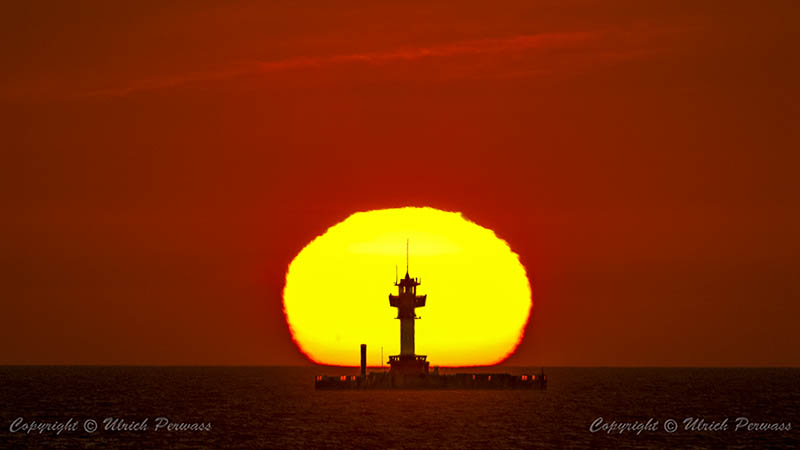 Leuchtturm Kiel bei Sonnenaufgang Keine 500m von der Ostsee entfernt lag diesmal unser Quartier hoch hoben auf der Steilküste bei Marienfelde, einem kleinen Ortsteil von Strande an der Kieler Förde. Wir hatten diesen Teil der Ostseeküste in den vergangenen Jahren schon öfter aufgesucht, weil die Aussicht weit hinaus auf das Meer so verlockend war und weil der jährliche Küstenabbruch immer wieder neue Steine aus der Endmoräne der letzten Eiszeit freilegt, die in ihrer Formenvielfalt so faszinierend uns begeistern. Diesmal also nur 500 m zu laufen, um weit nach Osten über den 7 km entfernten Kieler Leuchtturm hinweg dem Wettkampf der Segelbote bei ihrer ersten Regatta nach einem langen Winter zuzuschauen. Nach Osten also, da wo die Sonne aufgeht. Da müsste man doch eigentlich auch einmal den Sonnenaufgang fotografieren. Sonnenuntergänge habe ich ja schon öfter fotografiert, aber Sonnenaufgang? So früh am Morgen? Um 5 Uhr? Was mich reizte und aktiv werden ließ, war der Kieler Leuchtturm, der sich als Silhouette vor dem träge aus der Ostsee sich erhebenden Sonnenball präsentieren sollte. So träge war die Sonne dann doch auch wieder nicht. Ich musste mich sputen, um den passenden Blickwinkel zu erwischen. |