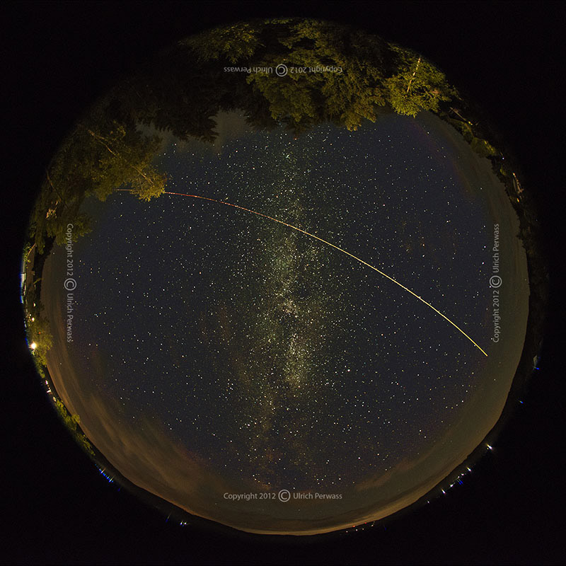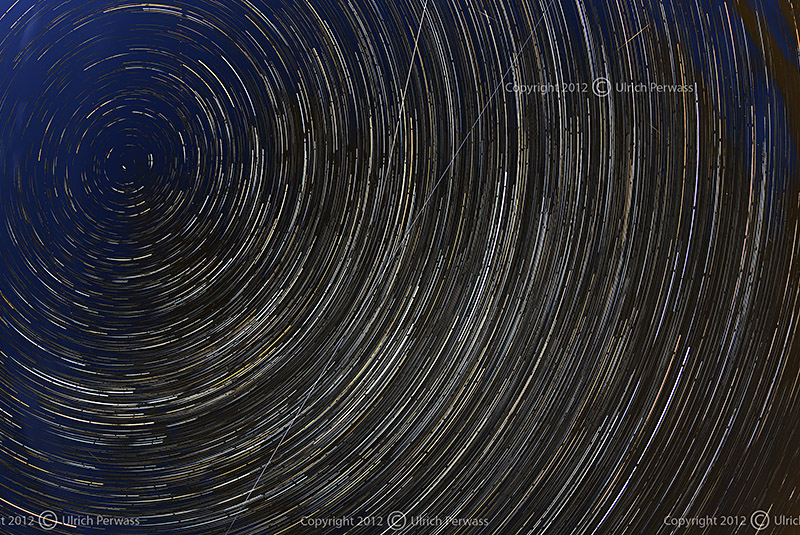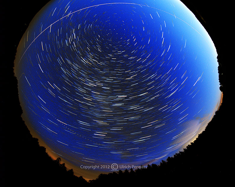 So schrieb ich meine Gedanken im Jahre 2005 auf, als ich in Schwarzenau im Rothaargebirge zum ersten Male versuchte, die Sternschnuppen der Perseiden zu fotografieren. Wie jedes Jahr waren wir auch diesmal um den 12. August herum in Schwarzenau. Zu dieser Zeit kreuzt die Erde einen Meteorstrom, der die Zahl der sichtbaren Sternschnuppen deutlich vergrößert. Der scheinbare Ursprung liegt im Sternbild Perseus. Daher der Name Perseiden. Sie sind die Auflösungsprodukte des Kometen 109P/Swift-Tuttle. Auf dem nachstehenden Bild erkennt man drei Sternschnuppen um den Copyright-Schriftzug rechts oben im Bild. Die langgezogenen Linien stammen von Satelliten, die gepunkteten Linien von Verkehrsflugzeugen mit ihren blinkenden Positionslichtern. In der Vollfensterdarstellung sind sie gut zu erkennen. Das Bild ist eine Gesamtdarstellung von 216 Aufnahmen mit jeweils 30 Sekunden Belichtungszeit bei Blende 4 und 800 ASA. Aufgenommen wurde mit der Nikon D800 und dem Fisheye-Objektiv AF Nikkor 10,5mm 1:2,8 G ED. Das Bildformat wurde automatisch auf 4800 x 3200 Pixel begrenzt. Die Aufnahmezeit war von 21:59:56.20 bis 23:59:59.10 Uhr |