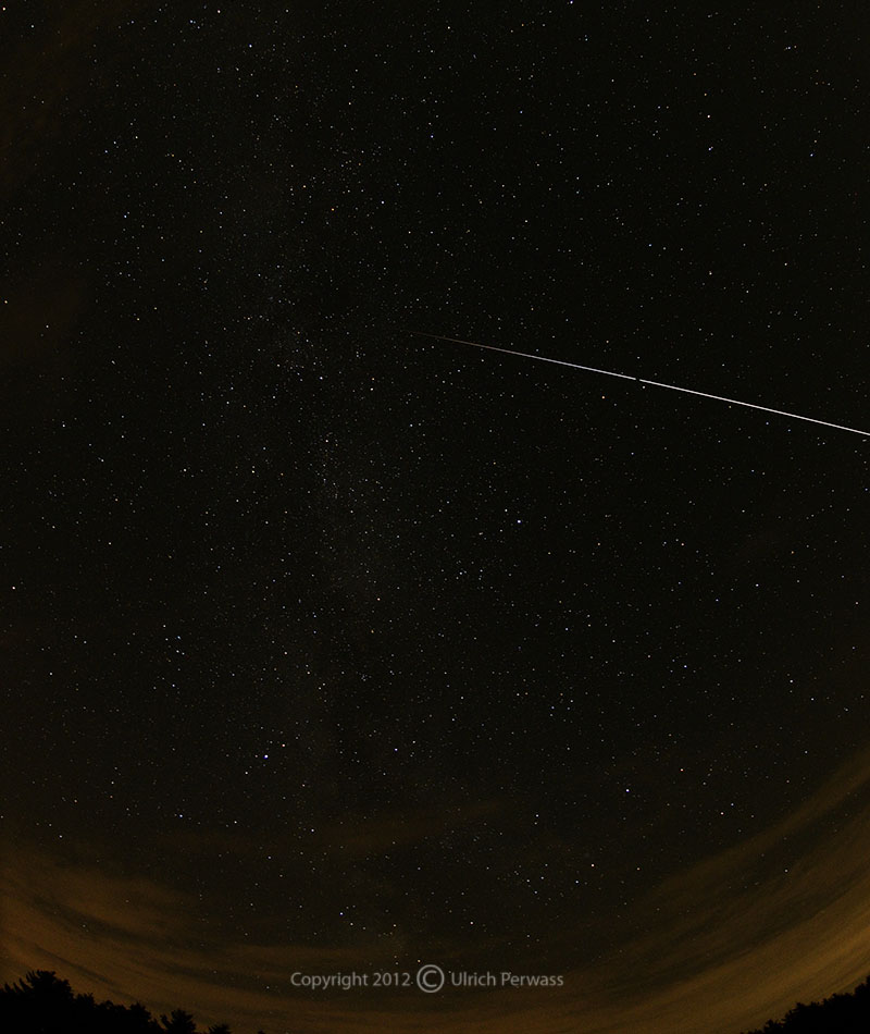ISS über Schwarzenau mit dem 8mm-Fisheye am 26.08.2012 aufgenommen. Die ISS-Spur ist aus insgesamt 9 Bildern in das letzte Bild hineinkopiert worden. Aufnahmezeit: von 00:44:50.00 Uhr bis 00:48:20.60 Uhr. Aufgenommen mit Nikon D800, SIGMA 8mm, 1:4 D EX, Belichtungszeit je Aufnahme 30s, Blende 4, ISO 3200