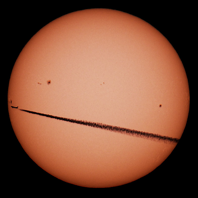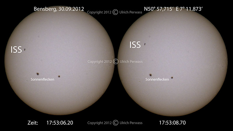"Was hat denn bloß die Internationale Raumstation ISS (International Space Station) mit Bensberg zu tun?" werden Sie mich sicher fragen. Nun am Sonntag Nachmittag (30.09.2012) gab es einen wunderschönen klaren blauen Himmel mit strahlender Sonne, so dass ich mich entschloss, mal wieder Sonnenflecken zu fotografieren (siehe Galerie 2011-06). Einige Aufnahmen waren schon im Kasten, da traute ich meinen Augen nicht: Ein dunkler, länglicher Fleck bewegte sich gleichmäßig von links nach rechts über die Sonnenscheibe und zwar genauso, wie ich es von Satellitenbewegungen bei Nacht her kannte. Wegen der Größe und Form kann das meiner Meinung nach nur die ISS sein. Wenn Sie vom Fach sind, wäre ich für eine Rückmeldung dankbar. Anschließend sehen Sie ein kleines Video und danach zwei Phasen des Durchlaufs, die auf der nächsten Seite auch im Vollbildmodus gezeigt werden. Bilder und Video sind mit der Nikon D800 aufgenommen.