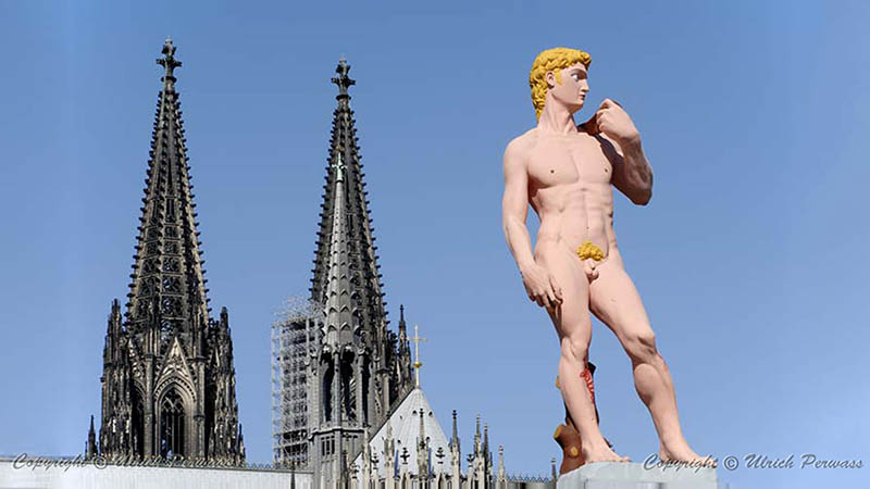 So lautete die Titelzeile unter einem Bild im Kölner Stadt Anzeiger vom 7. 02.2012 auf Seite 14, das eine Kopie des David von Michelangelo in Okuizumo, Japan zeigte. Ein generöser Geschäftsmann hatte seiner Heimatstadt dieses Kunstwerk geschenkt, nicht bedenkend, dass unbekleidete Statuen dort eher sehr selten sind. So regte sich sehr bald Volkes Unwillen und verlangte, dass David ein Höschen zu tragen habe. Verehrte japanische "Wutbürger" schauen Sie auf unsere Stadt, schauen Sie auf unser Heiliges Köln. Dort war David bereits am 30. April 2007 zu Gast, um ganz "natürlich" am Tanz in den Mai teilzunehmen und das auch noch direkt vor unserem heiligen Dom! Na ja, um Herrn Meisner, unseren Kardinal, nicht allzu sehr mit Gedanken an die "Pille danach" zu verwirren, hatte David seinen Haaren einen goldenen Hauch verliehen. Entsprechende Bemerkungen seitens des Apostolischen Legaten ("Legatus natus") sind mir daher auch nicht bekannt. Ich wünsche anregende Gedanken beim Besuch des Meisterwerkes von Michelangelo. Mit freundlichen Grüßen. Ulrich Perwass