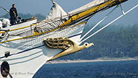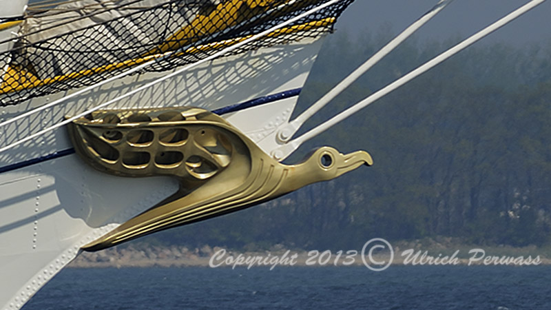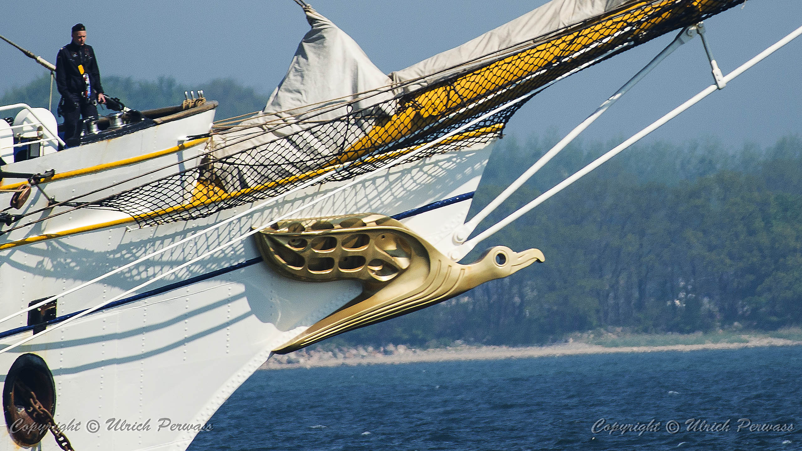 Der sechste Albatross der GORCH FOCK als derzeitige Galionsfigur Der erste und zweite Albatross waren aus Holz. Der erste riss ab, der zweite war zu schwer. Der dritte Albatross war aus Polyester. Er zerbrach bei einer Überholung. Der vierte Alabatross, ebenfalls aus Polyester, ging am 11. Dezember 2002 im Ärmelkanal und der fünfte aus Eschenholz am 5. Dezember 2003 vor der französischen Küste bei schwerer See verloren. Nun also geleitet der sechste Albatross die GORCH FOCK durch die Weltmeere. Er besteht aus kohlefaserverstärktem Kunststoff, wie die Tragflächen des Airbus A380. Allzeit gute Fahrt! |