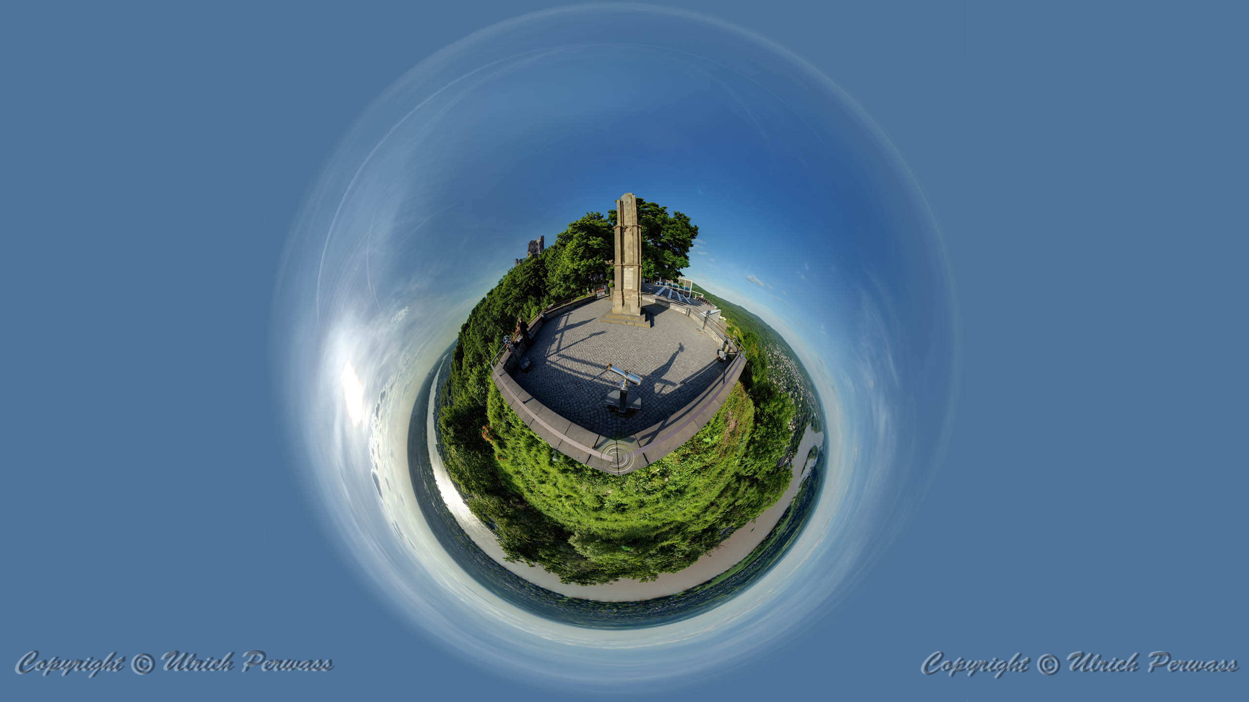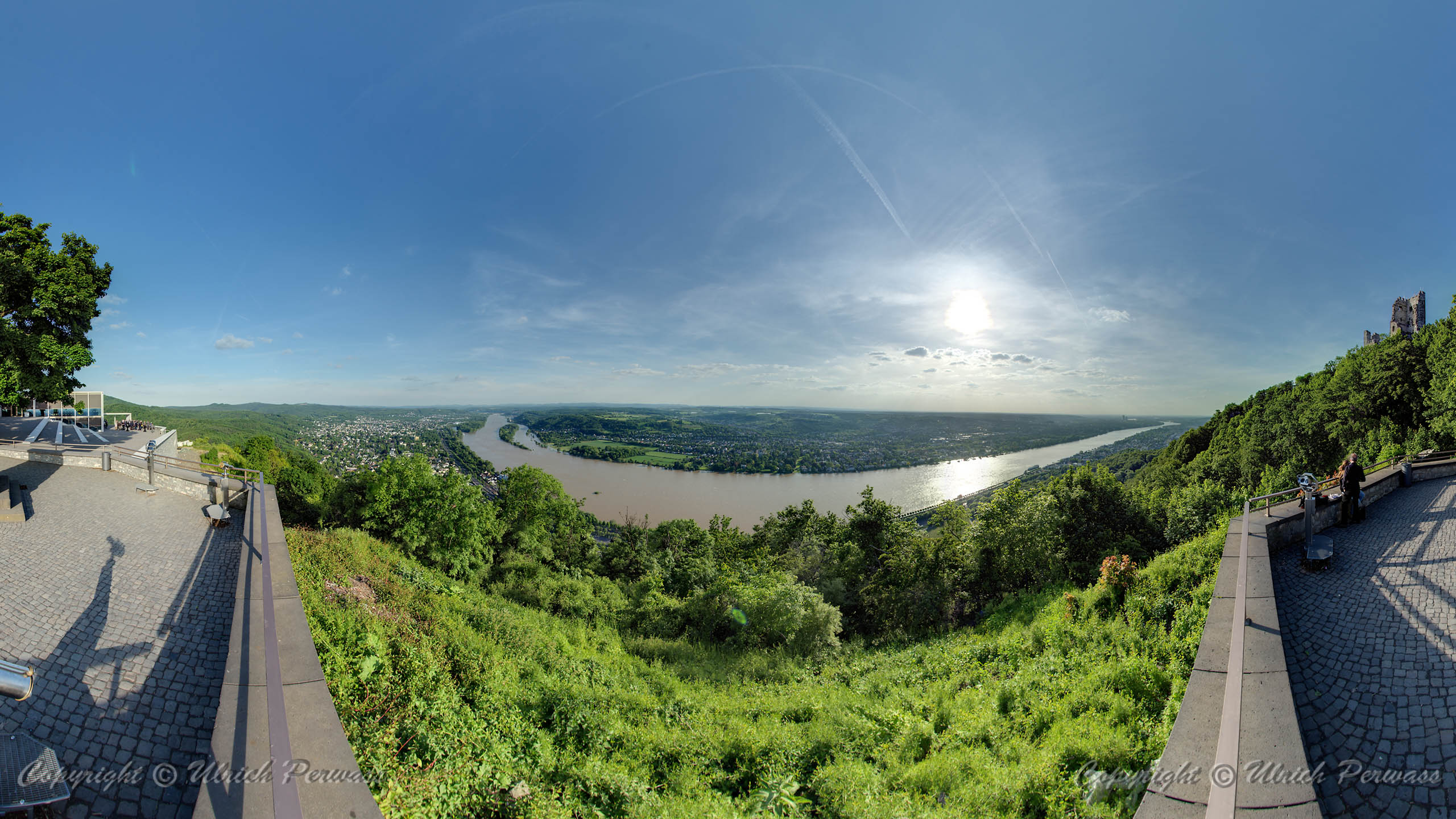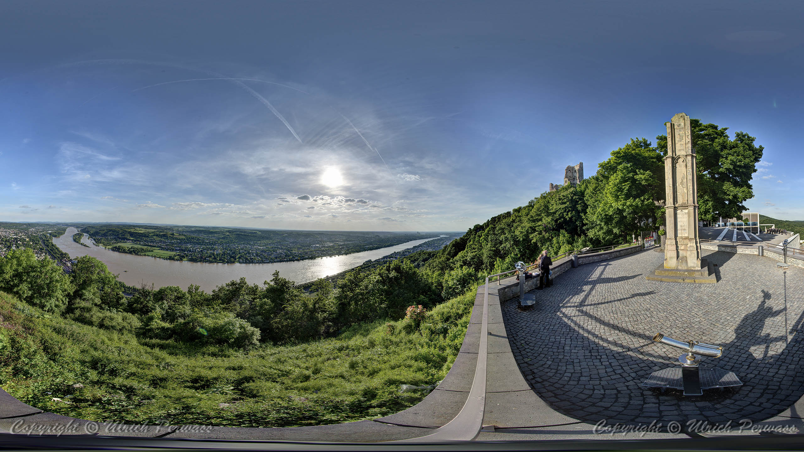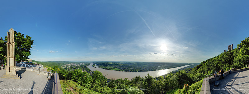 Spärisches Panorama Drachenfels Das spärische Panorama, bei dem Sie sich im Mittelpunkt einer Kugel befinden und mit der Maus die gewünschte Blickrichtung wählen, können Sie mit einem Klick auf das folgende Bild erreichen: |