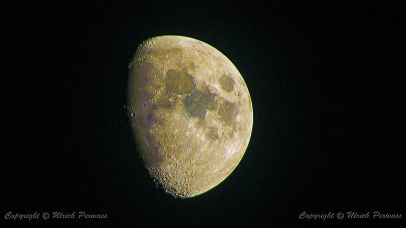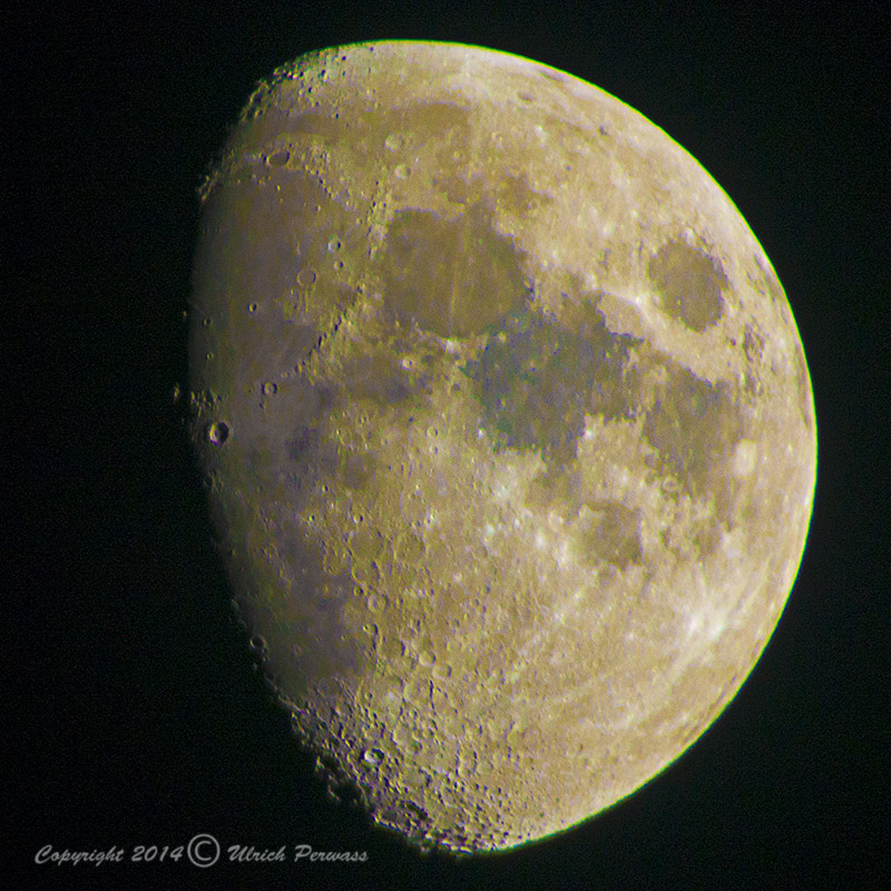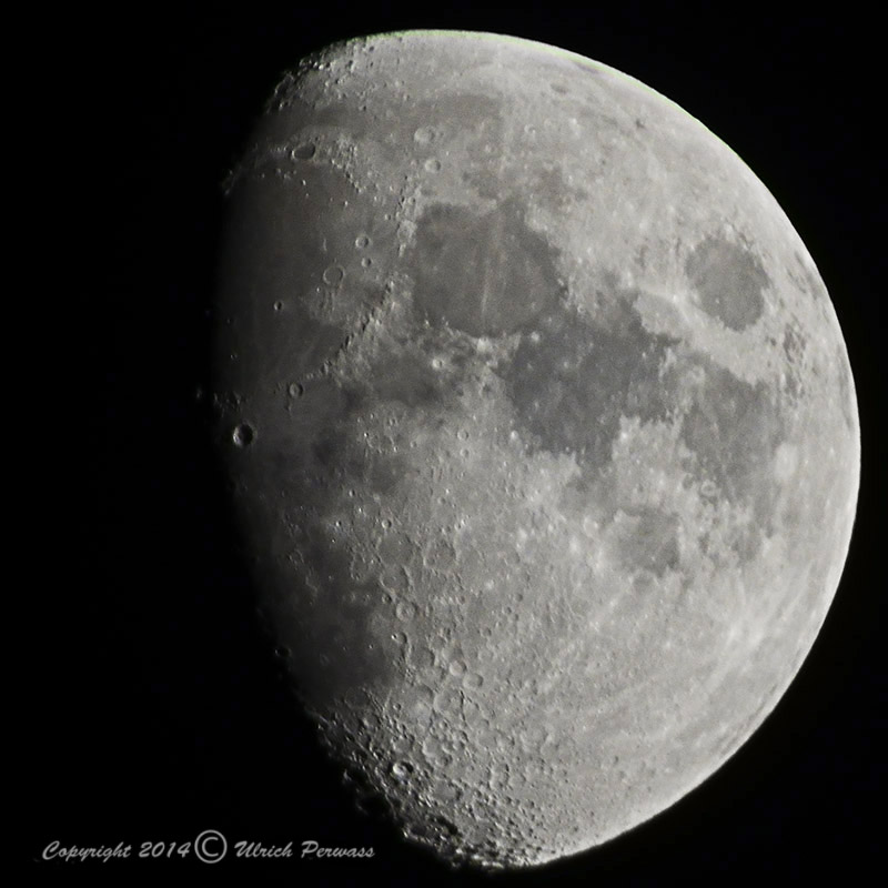 Halbmond im Januar 2014 Aufgenommen in einer der wenigen Wolkenlücken des neuen Jahres am 10. Januar 2014 um 19:24:29.6 Uhr mit Nikon D800, SIGMA 80-400mm, Nikon Telekonverter TC-20EIII 2x und SIGMA Teleconverter1.4 EX. Die Kombination aus Telezoom und zwei Telekonvertern ergab 1120 mm Brennweite und funktionierte offenbar ! (q.e.d.) Im unteren Bild sind die vorhandenen Farben mit Photoshop klargespült worden !!!