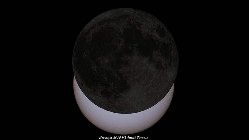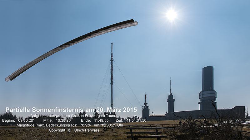 Am 20. März 2015 konnte wegen starker Bewölkung nur in Teilen Deutschlands die partielle Sonnenfinsternis gut beobachtet werden. Ich fuhr deshalb nachts um Punkt 4 Uhr 166 km bis zum Feldberg im Taunus. Ich hab es nicht bereut. Schauen Sie selbst. Nachfolgend sehen Sie eine Montage von 150 Phasen der Sonnenfinsternis. Davon sind 50 Phasen originale Aufnahmen im Abstand von 3 Minuten. Für ein Video wurden jeweils 2 Phasen im Ein-Minuten-Abstand hinzugefügt. Mit einem Klick auf das Bild geht es weiter. |