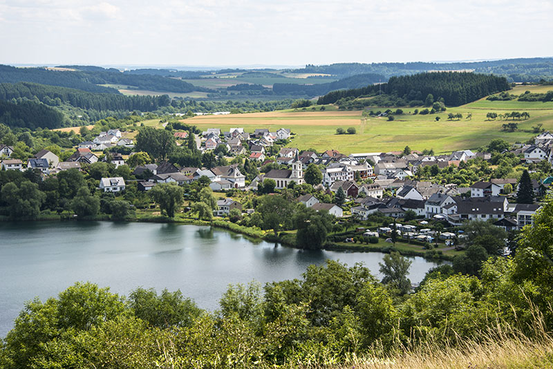 Schalkenmehren am Schalkenmehrener Maar Ein Maar ist, obwohl vulkanischen Ursprungs, kein vulkanischer Krater. Es ist eine eng begrenzte Landfläche, die nach einer unterirdischen Wasserdampfexplosion trichterförmig absank, als Grundwasser und heisses Magma in nicht allzu großer Tiefe vor etwa 10500 Jahren aufeinander trafen. Etwa 75 Maare gibt es in der Eifel, sowohl als Maarsee als auch als Trockenmaar. Das Schalkenmehrener Maar ist ein Doppelmaar, bestehend aus einem Maarsee und einem Trockenmaar (Hochmoor) und gehört zu den drei Dauner Maaren: Gemündener Maar, WeinfelderMaar, auch Totenmaar genannt, und eben das Schalkenmehrener Maar. |