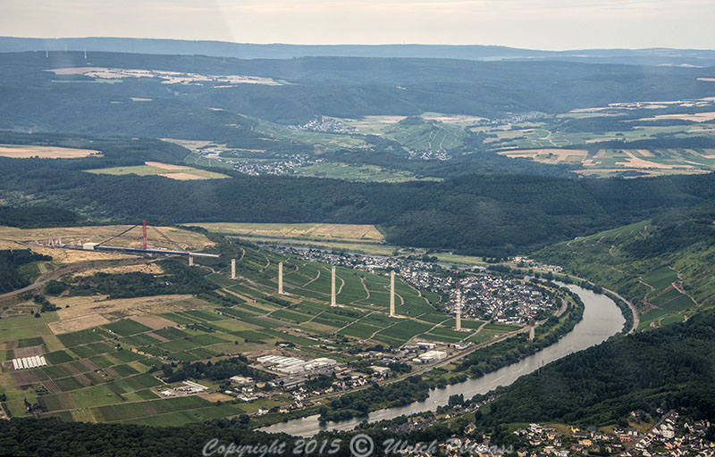 Hochmoselbrücke In einer Höhe von maximal 158m soll die im Bau befindliche Hochmoselbrücke zwischen Ürzig und Zeltingen-Rachtig das Moseltal überspannen. 2018 soll sie fertig sein und die Bundesstraße 50 mit vier Fahrstreifen und zwei Standstreifen aufnehmen. Sie wird 1702m lang und 29m breit sein. Gestützt wird sie von zehn Stahlbetonpfeilern, die 15 bis 150 m hoch sind. Der stählerne Brückenüberbau mit 32.000t Masse wird im Taktschiebeverfahren von der Hunsrückseite aus über die Pfeiler geschoben. Teflongleitlager ermöglichen dies. Auf dem Bild erkennt man links auf der Hunsrückseite das Montagezelt für neue Segmente des Brückenkastens, der bereits über Pfeiler 10 bis fast zum Pfeiler Nr. 9 vorgeschoben worden ist. Pfeiler 5 bis 1 sind noch im Bau. Stand: 26.07.2015 |