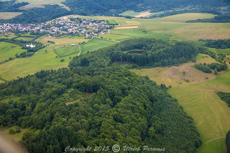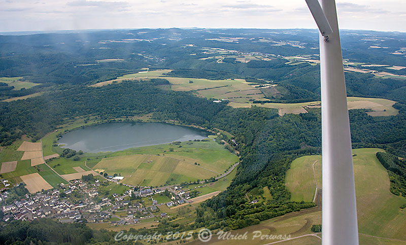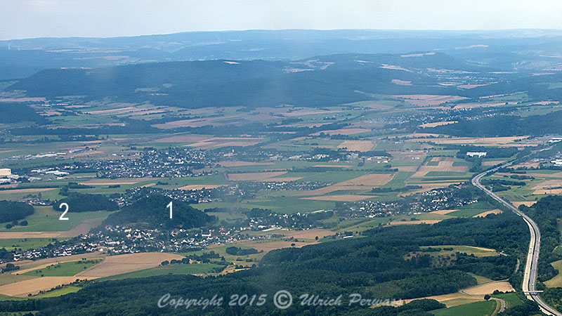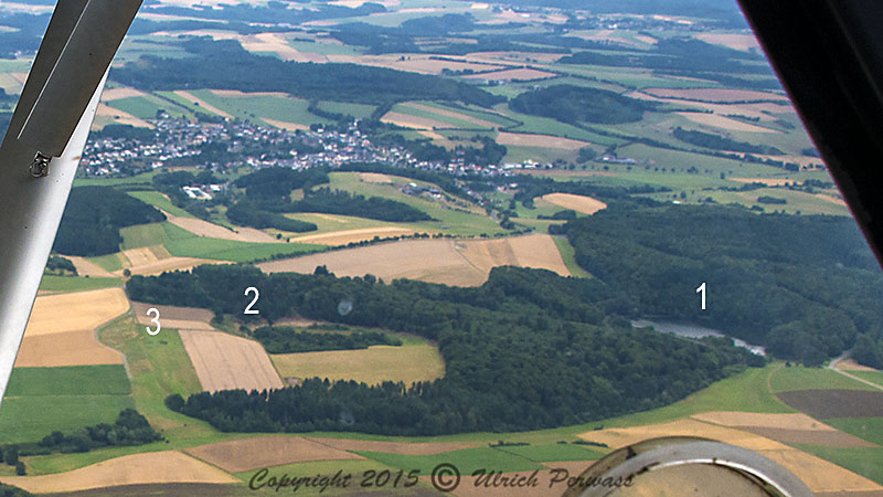 Drei Maare vor Gillenfeld Rechts, etwas oberhalb der Kabinenlüftung, liegt knapp im Wald das Holzmaar (1), dessen Wasserspiegel als etwas breiterer Strich erscheint. Links davon mit kleinem Sprung über den Wald in die nächste freie, U-förmige Ackerfläche hinein liegt am oberen Rand des Us das Trockenmaar "Dürres Maar" (2) und knapp davor das kleine trockene "Hitsche Maar" (3). Im Vordergrund ist die Autobahn A1 (Heiligenhafen (Ostsee) - Saarbrücken, Länge 774 km) zu erkennen, deren Lückenschluss von 25 Kilometern Länge(!) in der Eifel seit Jahren durch ideologische Querelen verhindert wird! Welche herrlichen Wandergebiete der Vulkaneifel sind dadurch aus dem Kölner Raum nur unter erschwerten Bedingungen und zusätzlicher Umweltverschmutzung zu erreichen! |