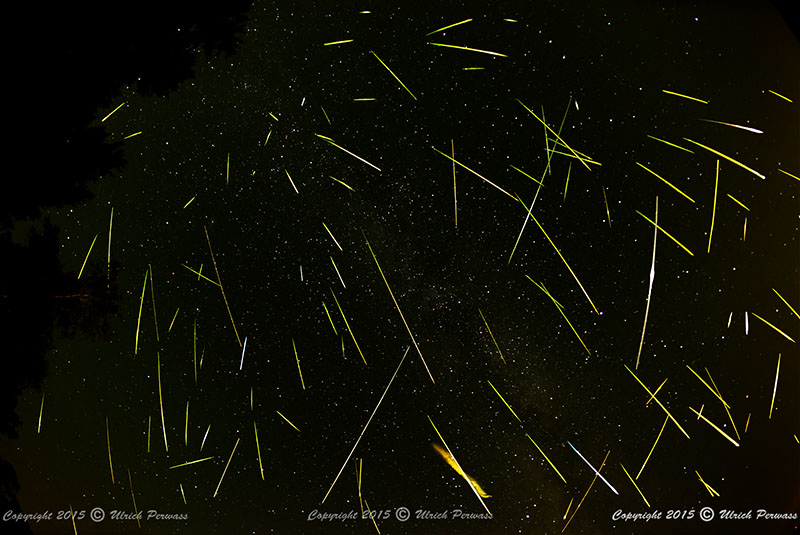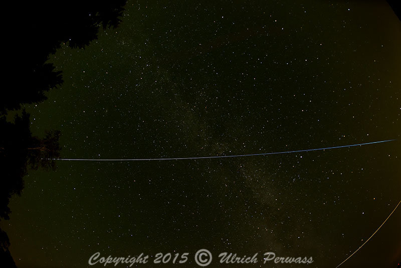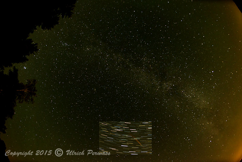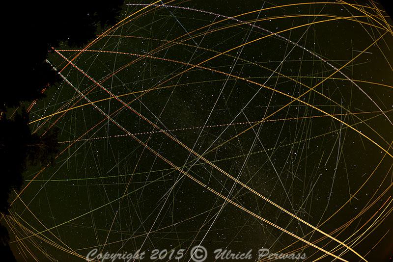 Wie jedes Jahr am 13. August war ich auch diesmal wieder in Schwarzenau bei Bad Berleburg im Rothaargebirge, um den Perseidenstrom zu beobachten, geheime Wünsche für die Zukunft zu gebären und um letztendlich auch dieses Naturschauspiel zu fotografieren, diesmal nicht fernab von der Dorfbeleuchtung auf einer einsamen Wiese, sondern hoch oben vom Kamin unserer Bleibe. Ich hatte Glück, denn nur die Nacht vom 12. auf den 13. August war sternenklar genug, um ein gutes Ergebnis zu erreichen. Zunächst riet uns Calsky die ISS von 21:55 bis 21:59 Uhr zu fotografieren, dann kam der Perseidenschwarm von 23:02 bis 4:24 Uhr dran. 613 Bilder mit der Nikon D800, Nikon Vollformat AF Fisheye 16mm 1:2,8. Die Belichtung ist ein Problem, denn die Sternschnuppen sind äußerst schnell und hinterlassen kaum Spuren auf dem Sensor. Nur die dicksten Brummer konkurieren mit den Sternen des Nachthimmels. 72 Sternschnuppen zählte mein holdes Weib. Auf dem folgenden Bild sind kaum eine Handvoll davon zu erkennen. Belichtung also 30s, Blende 4, ISO 800. Den Rest erledigte Photoshop.