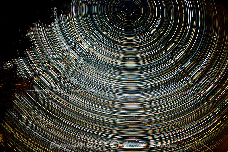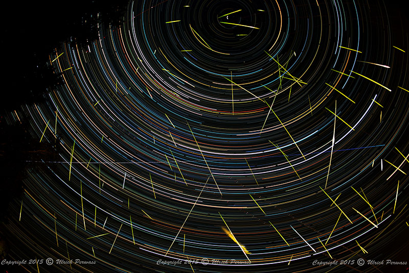 Hier direkt zum Hier also die erste Gesamtschau aus 613 Aufnahmen. 20 Aufnahmen entstanden von 21:55:20 bis 21:58:36 Uhr beim ersten ISS-Durchgang, so wie es Calsky vorhergesagt hatte. Knapp unterhalb der Bildmitte zieht sich die ISS-Spur von rechts nach links fast über die gesamte Bildbreite. Der zweite vorhergesagte ISS-Durchgang ist in der Ecke rechts unten als eine um 45 Grad nach unten geneigte gelbliche Spur zu erkennen. Er erfolgte von 23:27:44 bis 23:32:22 Uhr während der Aufnahme der nächsten 593 Bilder. Diese nächsten 593 Aufnahmen entstanden von 23:02:33 bis 04:24:12 Uhr als pausenlose Serienaufnahmen mit 30s Belichtungszeit bei Blende 4 mit ISO 800. Im Nachhinein wäre ISO 3200 für die Sternschnuppen wohl besser gewesen. Ich wollte jedoch auf jeden Fall eine Überbelichtung der Sterne verhindern, um deren Farben nicht ins Weiß abgleiten zu lassen. Zur Montage der Gesamtschau: Alle 613 Bilder wurden in Camera RAW gleichartig bearbeitet (Kontrast, Belichtungskorrektur, Farbsättigung) und nach TIF konvertiert. Anschließend wurden alle Bilder in Gruppen zu 19 Bildern (2 GB Grenze!) über ADOBE Bridge nach Photoshop CS6 als Ebenen geladen und diese dann mit dem Mischmodus "Aufhellen" kombiniert. |