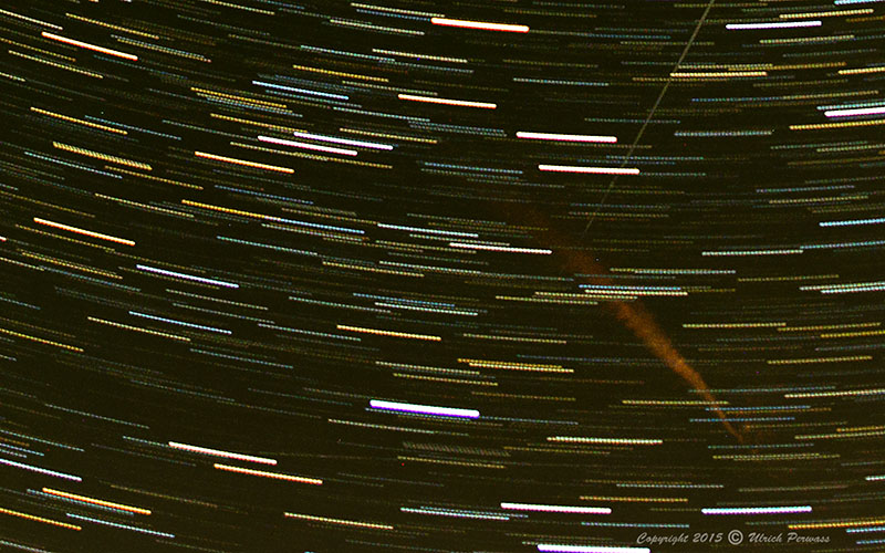 Phänomen UFO-Explosion bei den Schwarzenauer Lichtern 2015 Beim Extrahieren der Sternschnuppen staunte ich nicht schlecht, als ich am unteren Bildrand eine sich nach links oben ausbreitende Explosionswolke entdeckte. Diese Erscheinung zog sich über 25 Bilder hin und dauerte sichtbar somit etwa 13 Minuten. Sie begann am 13.08.2015 um 03:34:13.80' Uhr und endete sichtbar um 03:47:07.70' Uhr mitteleuropäischer Sommerzeit. Ein Bild davor (-30 Sekunden!) wurde eine sehr helle Sternschnuppe in gleicher Blickrichtung aufgenommen, zu sehen in "Endgültige Gesamtschau" am unteren Bildrand. Selbst in der "Ersten Gesamtschau" überstrahlt diese Sternschnuppe die sehr hellen Sternenspuren. Ich habe den Experten des DLR in Köln-Wahn, den Mathematiker und Himmelsgucker Rolf Hempel gebeten, sich der Sache anzunehmen. Falls Sie, verehrter Gast, eine Erklärung für dieses UFO-Phänomen haben, wäre ich Ihnen für eine kurze Mitteilung dankbar. Inzwischen (28.08.2015) habe ich im Internet nach "UFO-Explosion 13.08.2015" gesucht. Erstaunlich ist, was da alles am 13. August 2015 explodiert sein soll. Keines dieser Suchergebnisse konnte ich allerdings mit der Blickrichtung Süden meiner Aufnahme in Verbindung bringen. Die Suche geht also weiter!