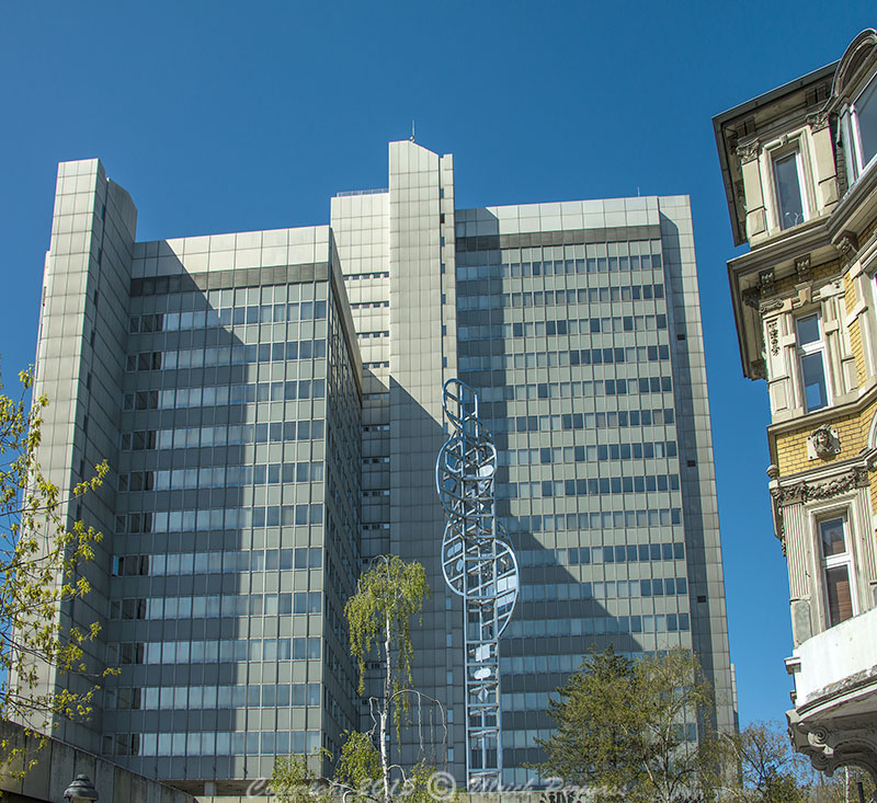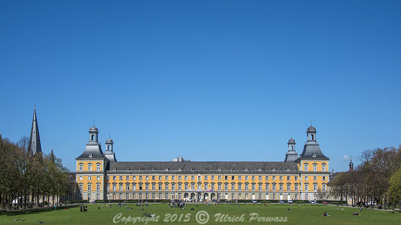 Rheinpanorama mit Siebengebirge (vom Ölberg bis zum Drachenfels) sowie Langer Eugen (Gerstenmaier), ehemals Abgeordnetenhochhaus und direkt dahinter der Posttower |
