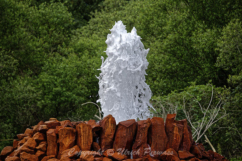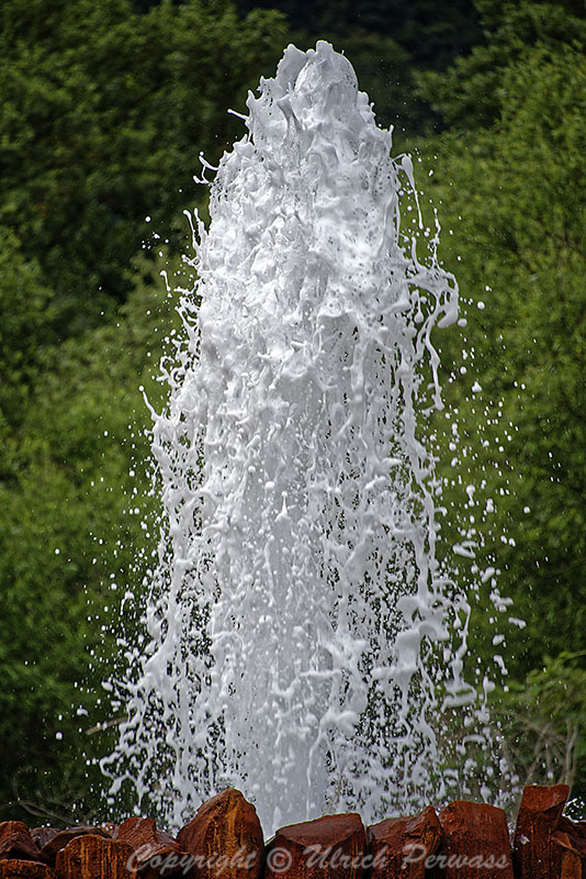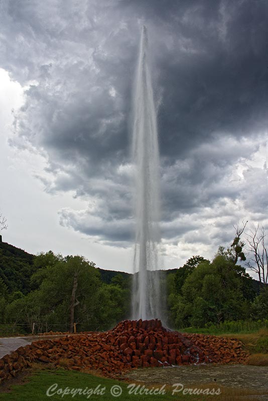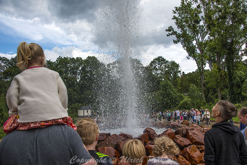 Ja, Sie haben richtig gelesen. Solch eine Naturerscheinung gibt es nicht nur auf dem fernen Island oder dem Yellowstone-Nationalpark sondern auch hier bei uns in der Nähe von Andernach am Rande der Vulkan-Eifel auf der Halbinsel Namedyer Werth (= Insel), wo sich schon im Jahre 859 die drei Könige Karl II. (der Kahle), Ludwig II. (der Deutsche) und Lothar II. getroffen haben, um das Phänomen des aus dem Boden austretenden Gases CO2 (Kohlendioxyd) zu bestaunen und das leicht salzige Mineralwasser zu genießen. Schließlich bohrte man im Jahre 1902 das Phänomen an und erhielt so einen Kaltwasser-Geysir von etwa 40 Metern Höhe, der bis 1957 funktionierte. 2001 wurde erneut eine Bohrung bis auf 350 Metern niedergebracht und gegen den hinhaltenden Widerstand von alten greisenhaften und störrischen Naturschützern 2006 in Betrieb genommen. Seitdem springt der Geysir tagsüber wieder im natürlichen Rythmus bis zu 60m hoch ! Nachts wird er mit einem Schieber verschlossen.