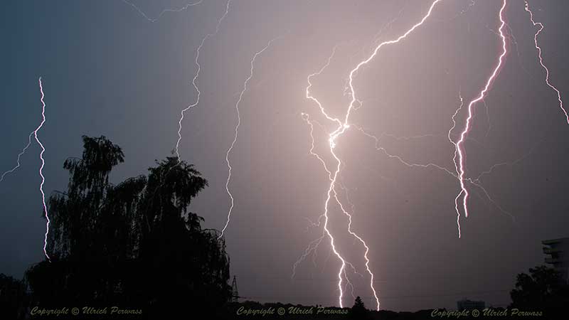 Blitze über Moitzfeld Am 3. Juni 2016. Dieses Gewitter zog südwestlich weiter zur Eifel und störte dort das Musikfestival "Rock am Ring" und verletzte über 50 Musicfans bei einem Blitzeinschlag. Die Gefährlichkeit dieser Naturgewalt war mir schon bewußt, als die sonst über Moitzfeld Richtung Freudenthal startenden Passagierjets in Höhe Moitzfeld/Steinacker nach Süden abdrehten und versuchten, möglichst schnell Höhe zu gewinnen , um so der Gewitterwand, die sich offensichtlich hinter mir im Norden befand, zu entkommen. |