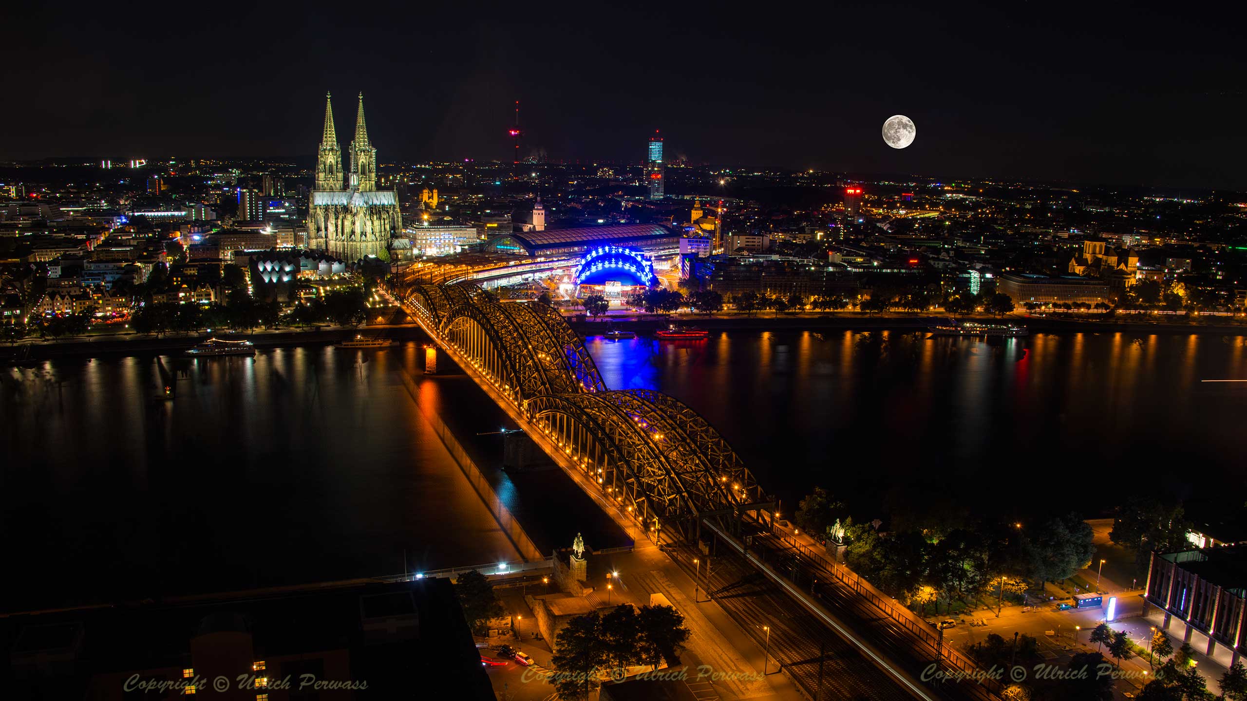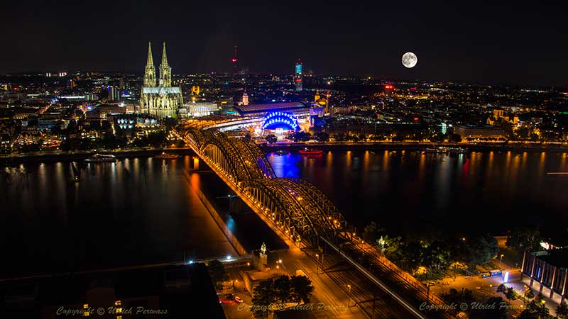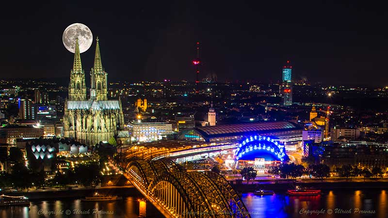 Supermond über Köln in 356.509 Kilometer Entfernung am Montag, den 14. November 2016 bei wolkenverhangenem Himmel. Nächster Supermond leider erst wieder am 7. April 2020 ! Bis dahin muss ich mich mit einem Trugbild begnügen, das dank Photoshop sehr leicht herzustellen war! |