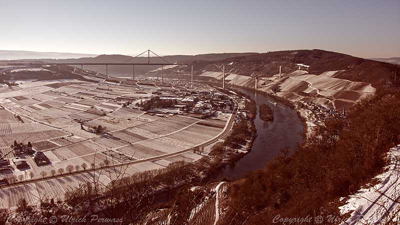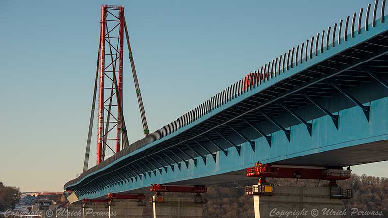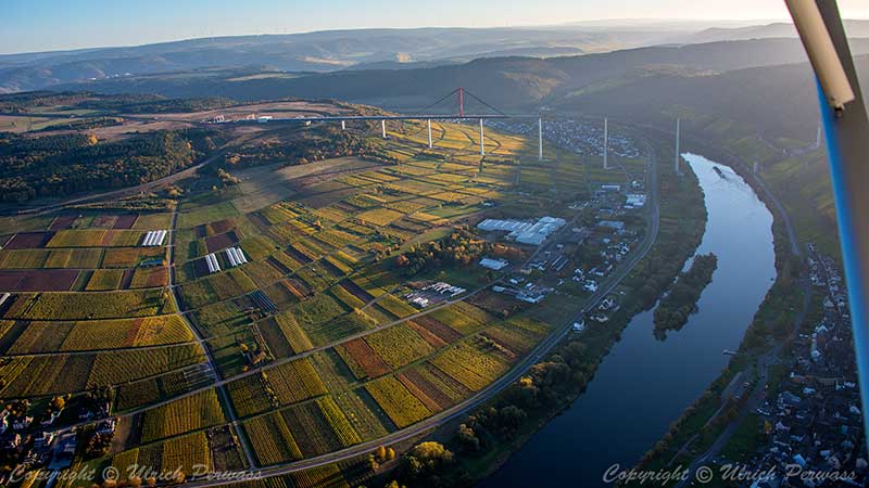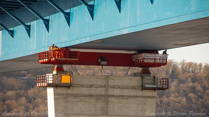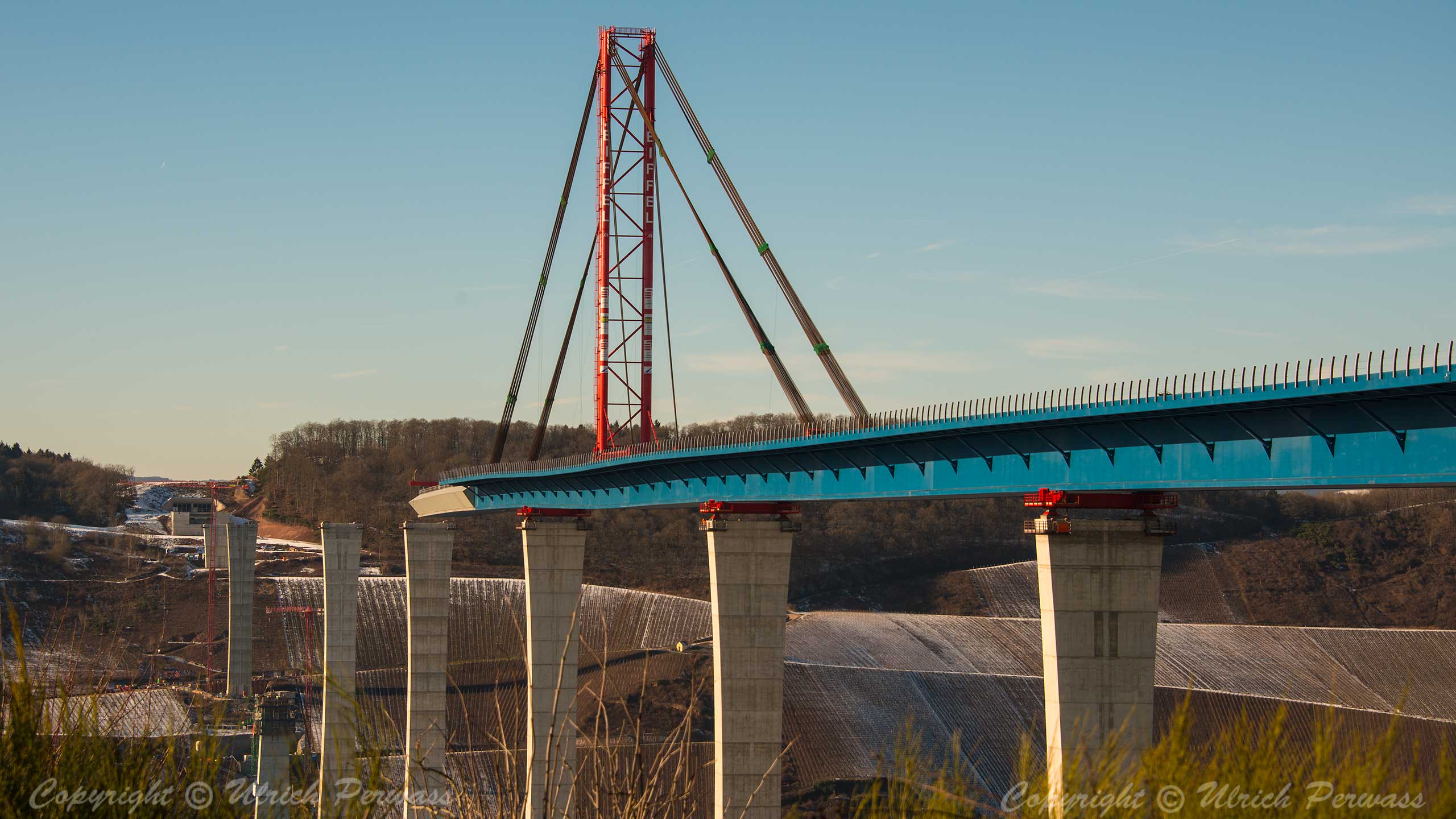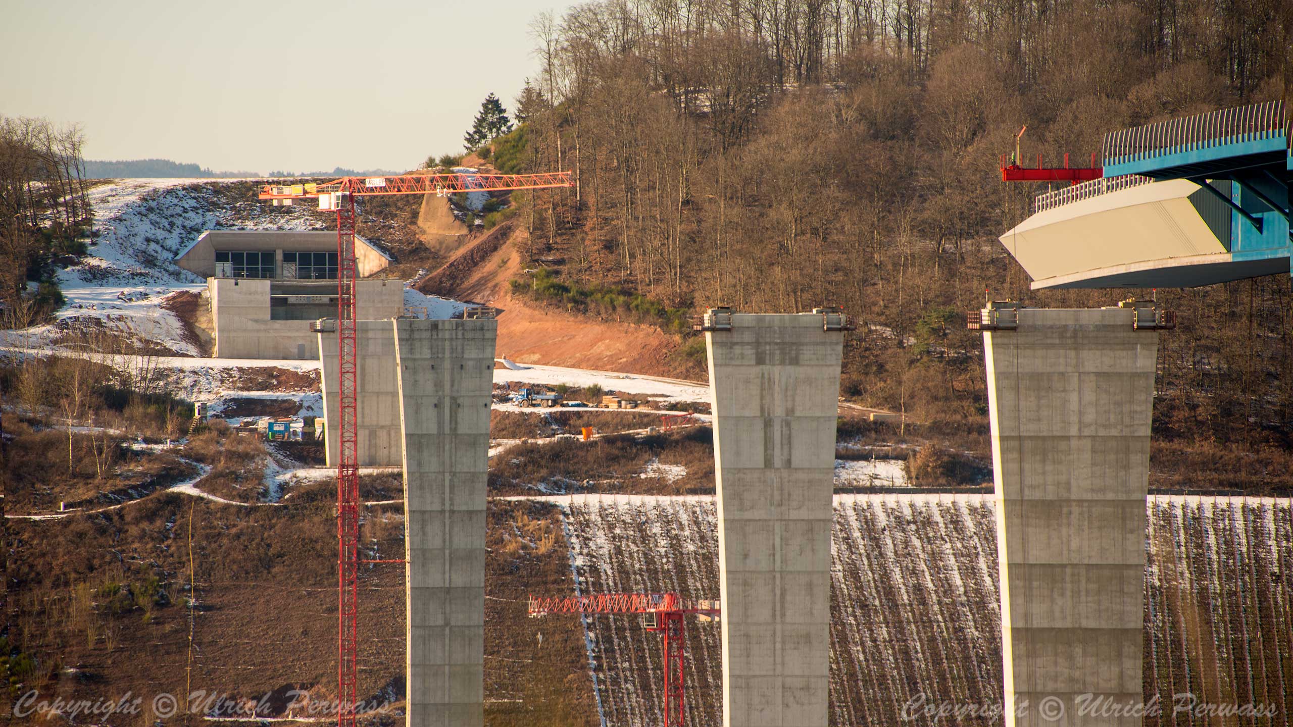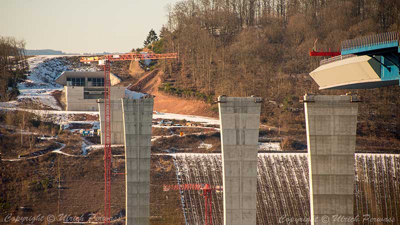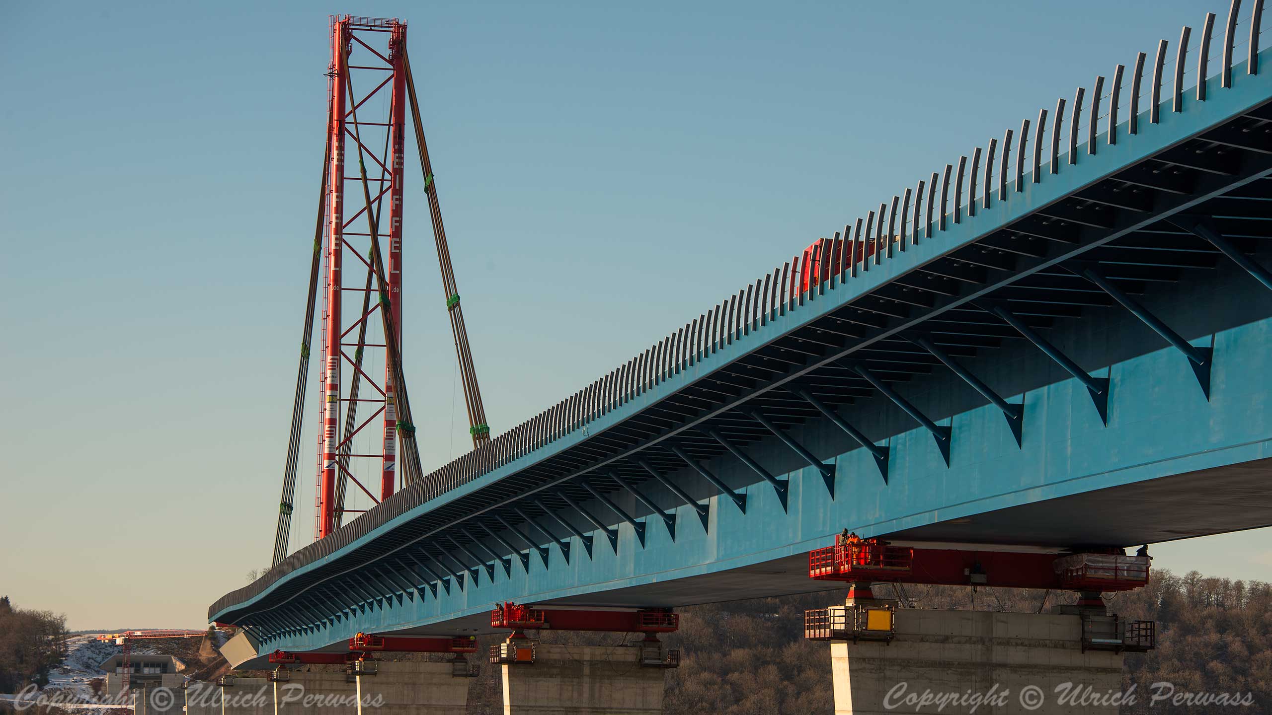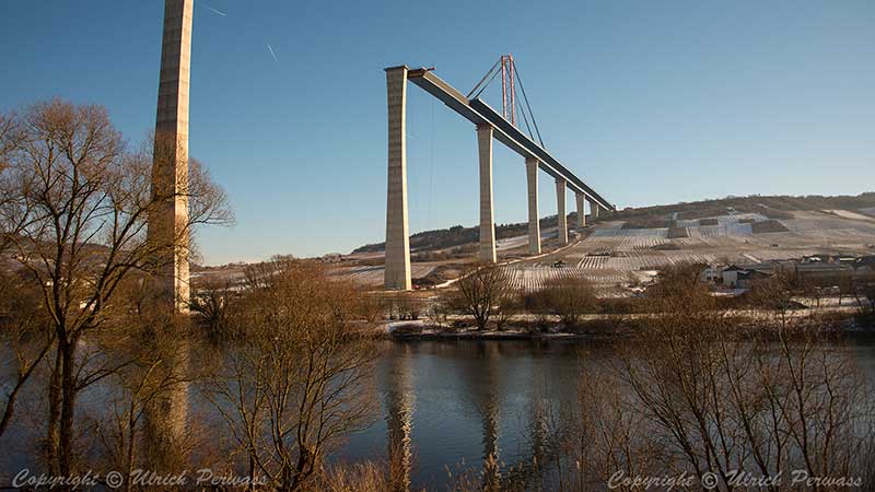 Der Bau der Hochmoselbrücke schreitet gut voran. Der 8. Vorschub lockte mich bei strahlendem Sonnenschein für zwei Tage an die Mosel. So konnte ich das Erreichen des 5. Pfeilers unter fachlicher Betreuung durch den Tourist Service Hans Peter Kuhn im Auftrag des BIZ hautnah miterleben und fotografieren. Übrigens immer Freitags startet die Besuchertour um 14 Uhr vom BIZ. Sie können von dort dann mit dem eigenen Wagen zur Baustelle hinauffahren. Der nächste Vorschub findet im Mai statt. Wunderschöne Aufnahmen hat mir Weinkenner und Fotograf Peter Nicolay zur Verfügung gestellt, die die Einbindung dieses technischen Meisterwerkes in die herrliche Landschaft der Mosel verinnerlichen. Nun zu meinen Bildern, die Sie jetzt auch im Vollbildmodus anschauen können. Die ersten drei Bilder aus dem Jahre 2016 hier nochmals als Vollbild. Viel Spaß! |