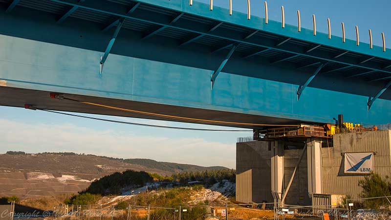 Zwei wunderschöne, sonnige Tage waren angesagt, so dass ich mich am Freitag, den 20. Januar auf die "Socken" machte, um das Ende des 8. Vorschubs der Hochmoselbrücke zu erleben. Die vom BIZ organisierte Führung begann pünktlich um 14 Uhr mit mir als einzigem Teilnehmer. Deshalb herzlichen Dank an H. P. Kuhn, der diese Führung trotzdem sehr sachverständig durchführte. Seine Kenntnisse über Land und Leute, Topographie, Mineralogie und Geologie waren beeindruckend und ließen diese Führung ein Erlebnis für mich werden, an das ich mich gerne erinnern werde. Die geologischen Schwierigkeiten auf der Eifelseite verschwieg er nicht. Dort müssen riesige Erddübel bis 70m Tiefe versenkt werden, um ein Abrutschen des Hanges vorsichtshalber auszuschließen. Hier stellte Herr Kuhn mir einige seiner Bilder zur Verfügung, die er noch am Freitag abend von der Dübelbaustelle machte. Der Vorschub des Brückenkastens erfolgt in 13 Abschnitten. Heute nun also der achte Vorschub. Hierzu werden 5 Vorschubstationen auf dem Vormontageplatz und dem Widerlager Hunsrück eingesetzt sowie jeweils eine auf jedem Pfeiler, um ein Umdrücken des Pfeilers zu verhindern. In jeder Vorschubstation gleitet der Brückkasten auf jeder Seite auf sieben 50 x 50 cm großen Stahlplatten, die mit dem Brückkasten mitwandern, da oben auf diesen eine schwarze Haftlamelle und unten eine helle Teflongleitlamelle eingelegt ist. Diese Gleitplatten müssen also regelmäßig nachgelegt werden, da sie am Ende des Vorschubbalkens mit lautem Geräusch wieder herausfallen. Das Gleiten wird durch eine spezielle Gleitflüssigkeit auf der Gleitlamelle weiter verbessert. Da die Brücke 0,53% Gefälle in Richtung Eifel hat, muss sie gegen Wegrutschen am Widerlager Hunsrück durch Seile gesichert werden, die nur soweit freigegeben werden, dass die Vorschubweite erreicht werden kann.