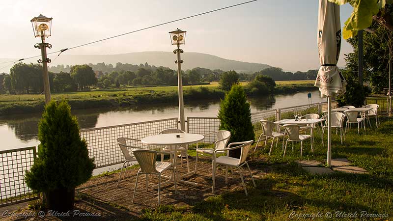 Radtour an der Weser Von Reinhardshagen nach Bad Karlshafen Auf der Suche nach einer guten Unterkunft wurde ich direkt an der Fähre nach Hemeln in Reinhardshagen fündig: Das Hotel Peter dort bot eine gediegene und ruhige Unterkunft, bekömmliches und sehr schmackhaftes Essen und eine wunderschöne Weserterrasse, auf der ich am Abend hoch über dem Fluss den Tag bei einem kühlen Bier genüsslich ausklingen lassen konnte.