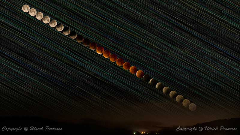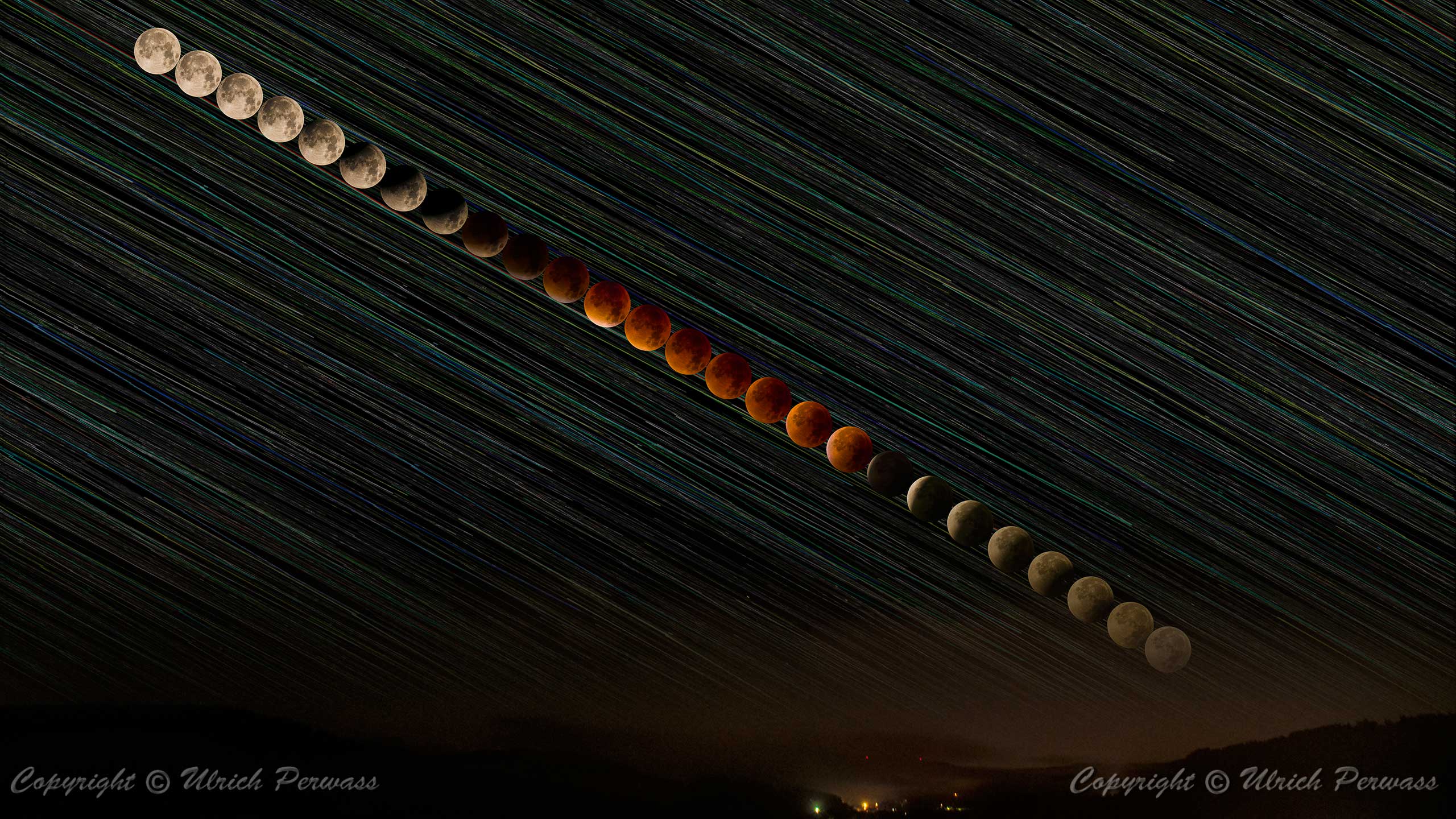 Im nachstehenden Bild sehen Sie den Blutmond in Phasen von 10 Minuten Abstand. Die Größe des Mondes ist dem Phasenabstand angepaßt, um eine bessere Mondsicht zu haben. Klicken Sie auf das Bild, um es im Vollbildmodus anzuschauen.
