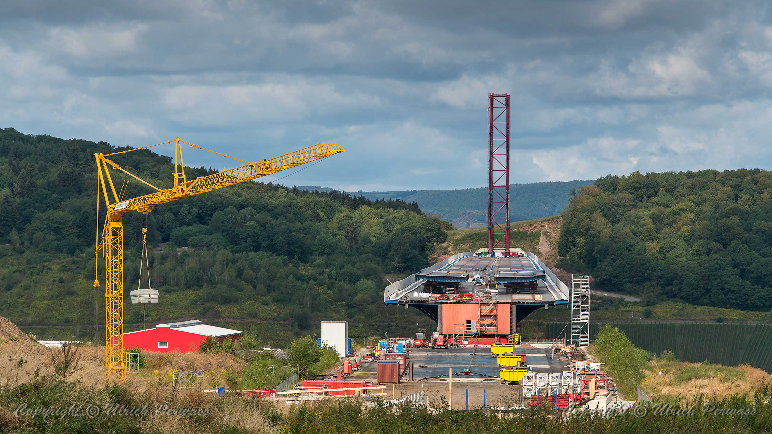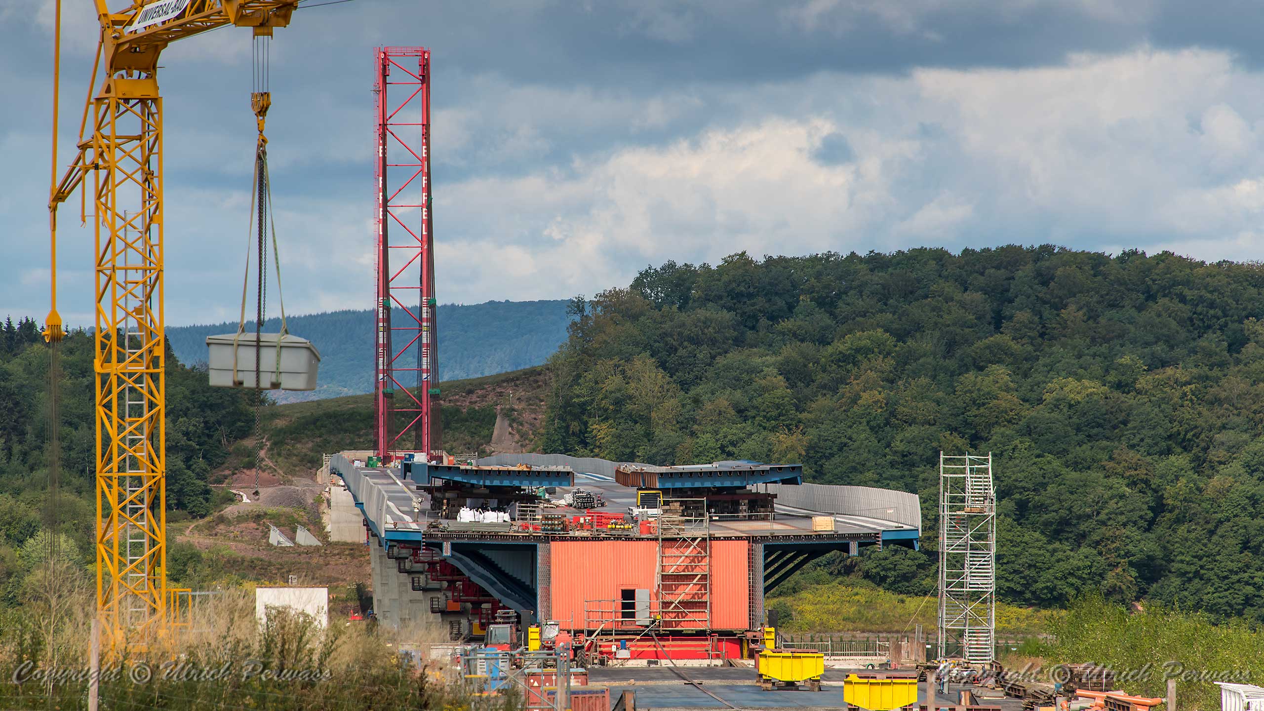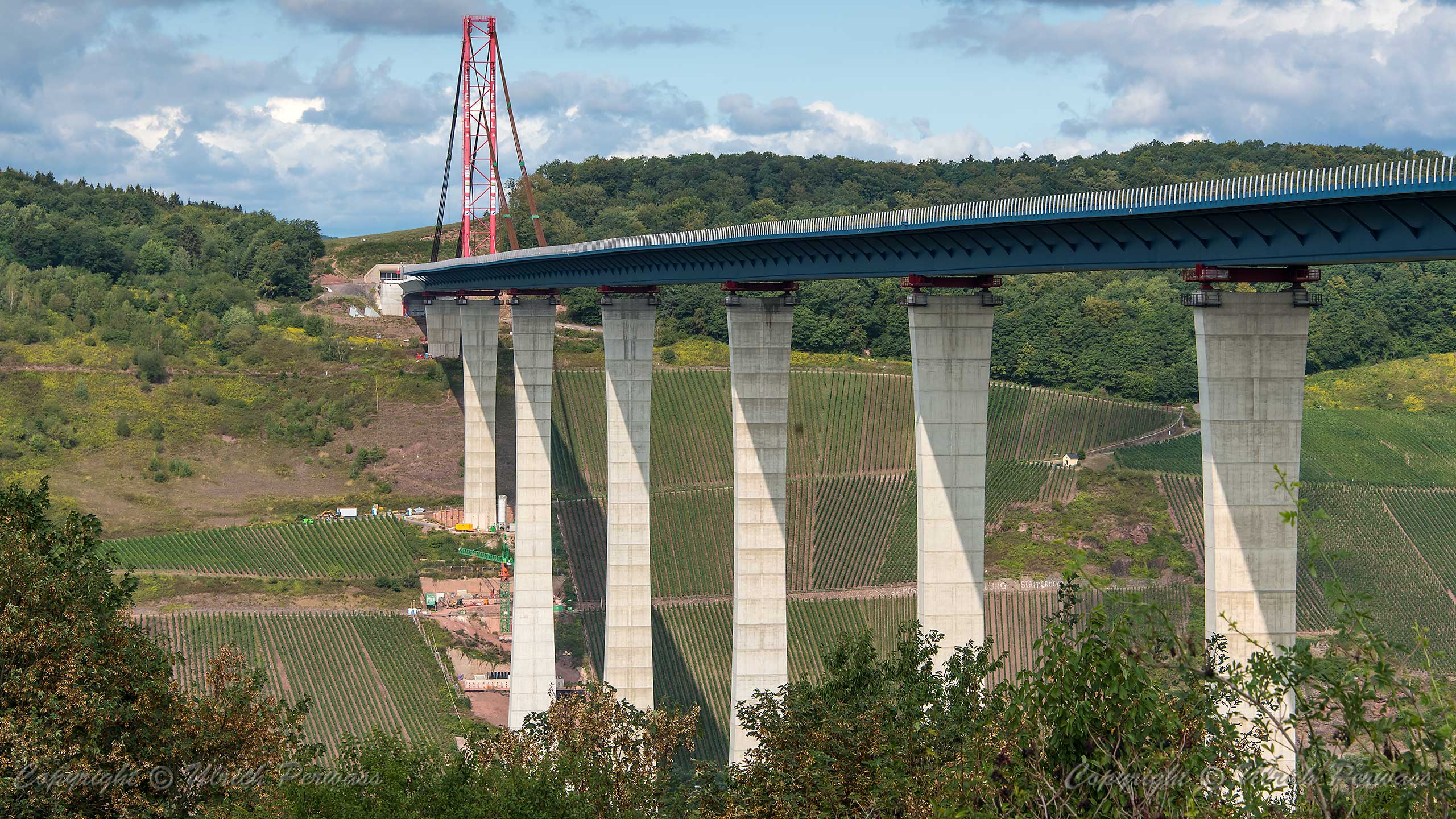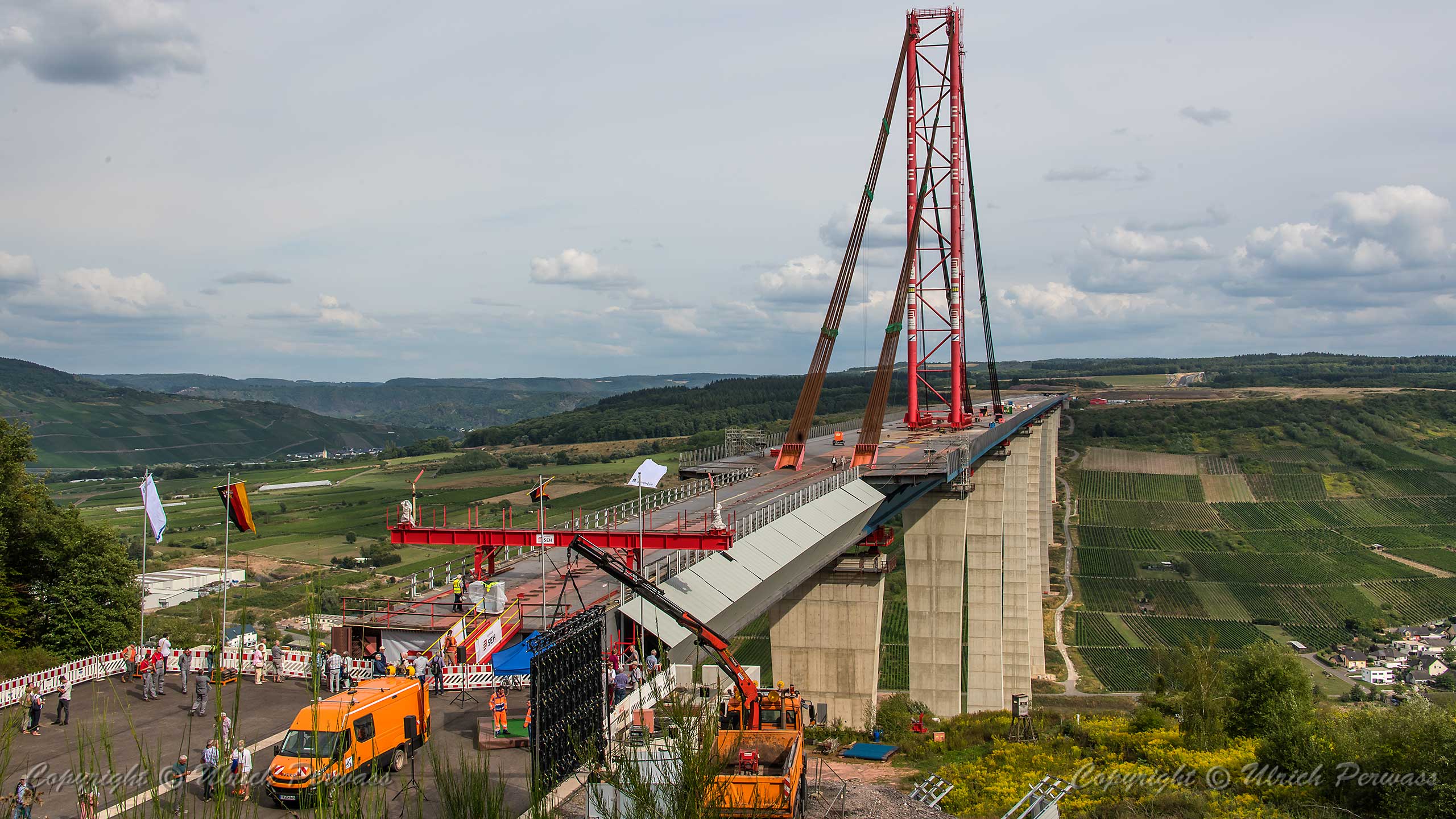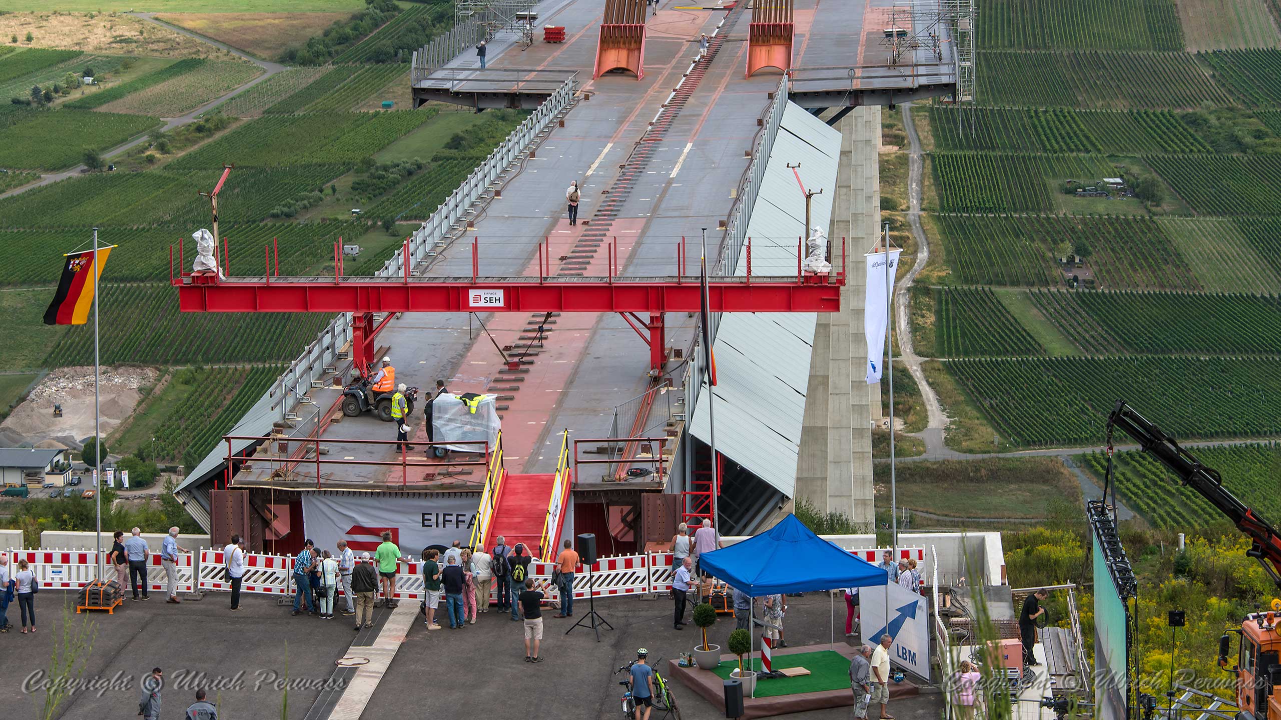 Hochmoselbrücke Finaler Vorschub am 24.08.2018 Gemütlich schaukelte ich am Freitag früh die 175 km von Bensberg nach Ürzig, um den Abschluss meiner jahrelangen Fotosafaris zur Baustelle der Hochmoselbrücke in der wunderschönen Mosellandschaft zu genießen. Ich war der erste Gast um 11 Uhr Morgens, als ich von einem Security-Mann gefragt wurde, ob ich denn zum Demonstrieren gekommen sei. "Nein," war natürlich meine Antwort, "ich suche nur einen Parkplatz." Den fand ich auf der neuen 2,6 km langen B50n beidseitig zur Genüge. Ich war nämlich der allererste Parkplatznutzer, der seinen Wagen etwas schräg stellen sollte, damit die Nachfolger es mir gleich tun würden. Das taten die denn auch, und zwar vierspurig die gesamte 2,6 km lange Strecke bis zum Kreisel Platten. Das Interesse am Rohbauende der Hochmoselbrücke war also gewaltig und verlief äußerst friedlich! Auf halber Höhe fand ich einen guten Platz für mein Stativ und meine NIKON. Sehen Sie hier das Ergebnis: