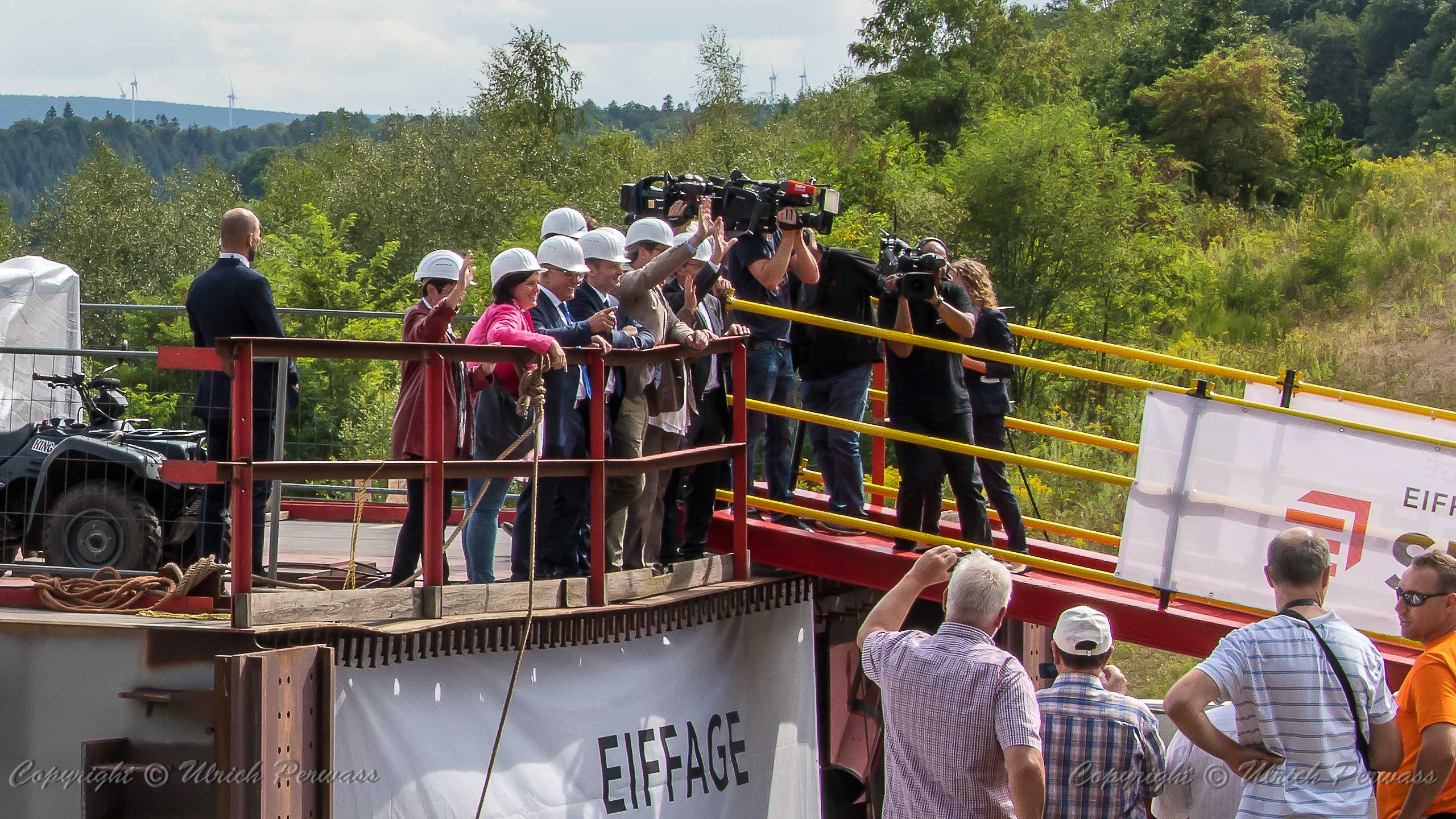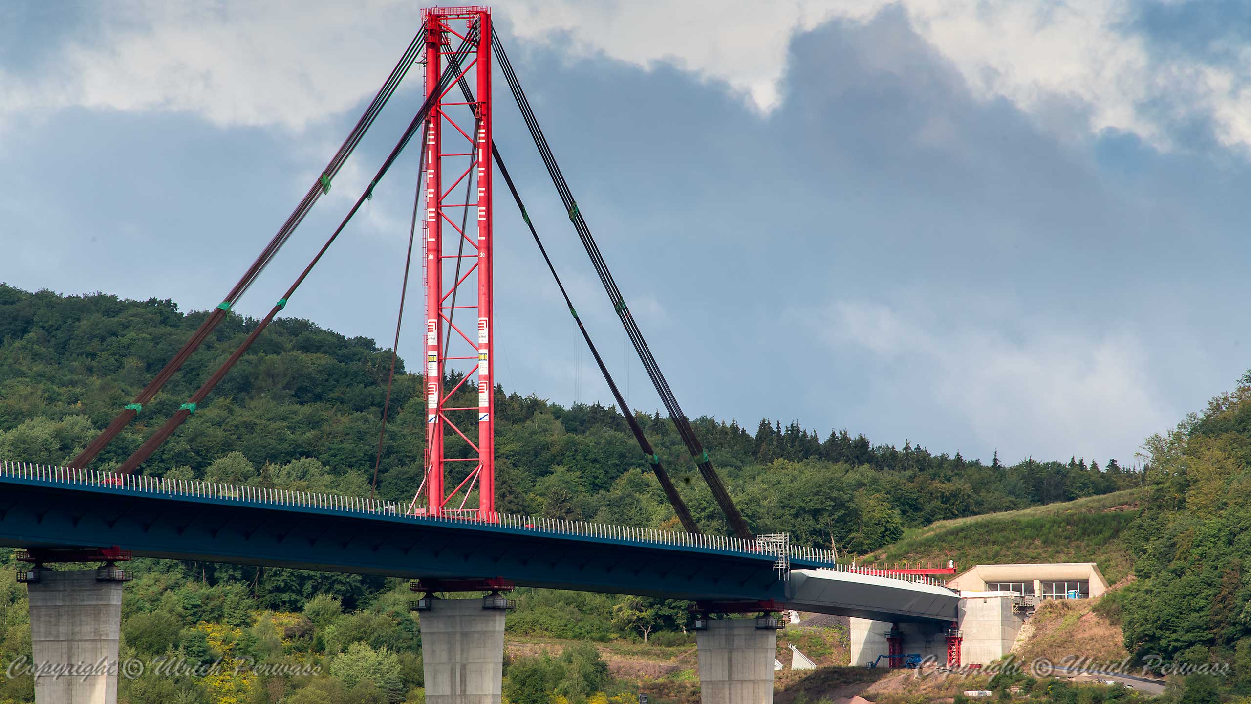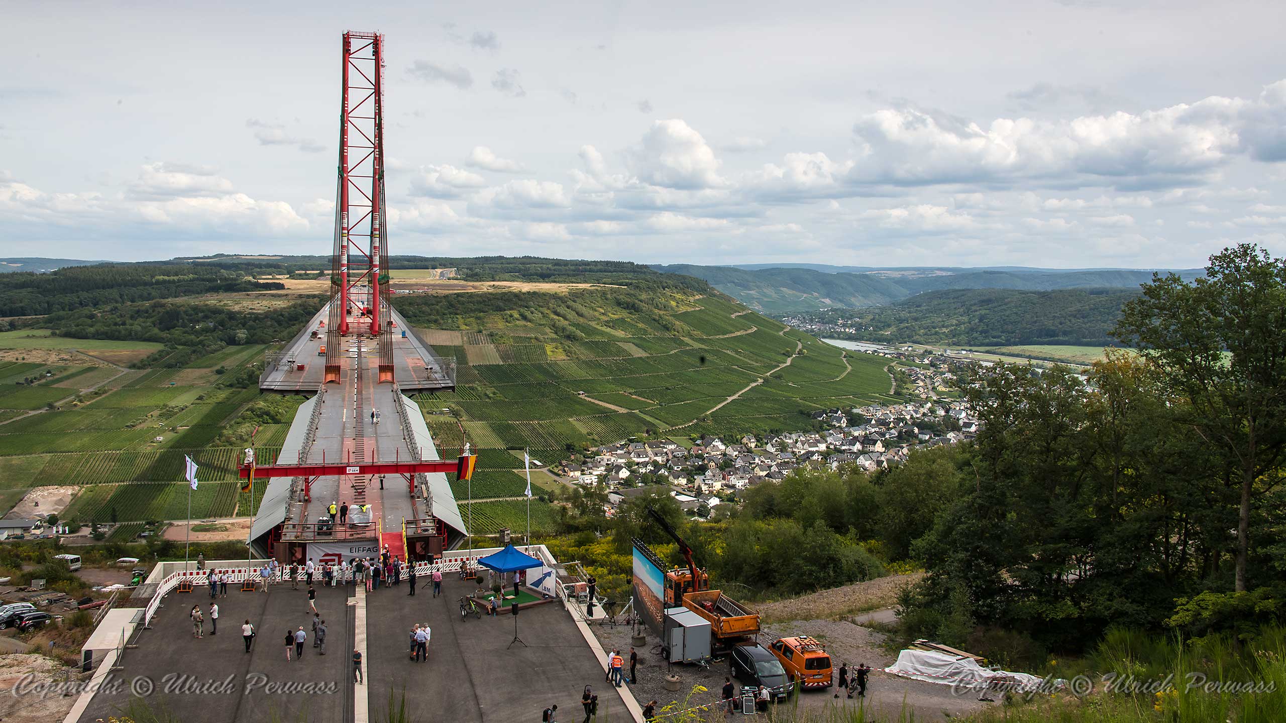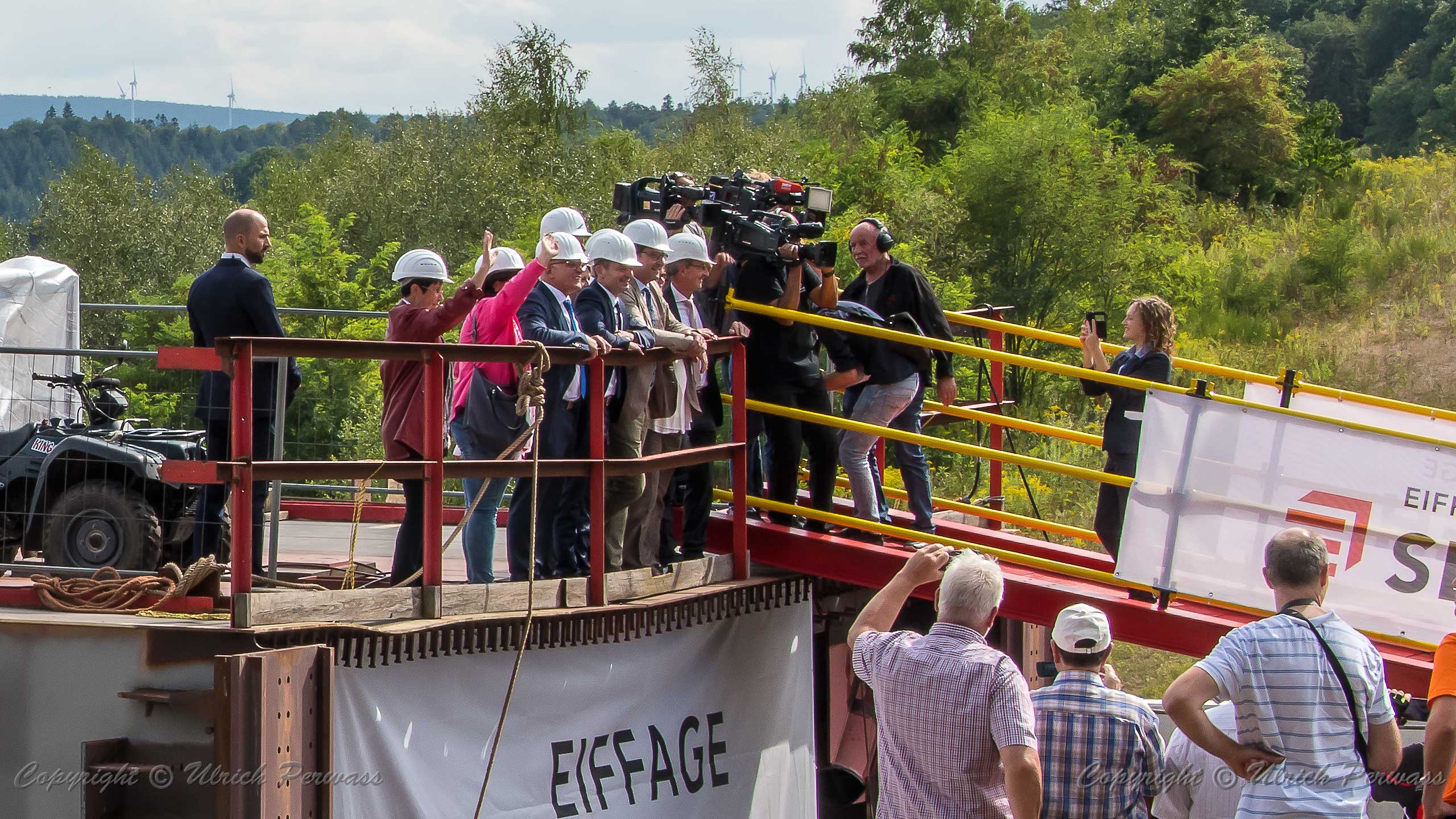 Hochmoselbrücke Finaler Vorschub am 24.08.2018 Gemütlich schaukelte ich am Freitag früh die 175 km von Bensberg nach Ürzig, um den Abschluss meiner jahrelangen Fotosafaris zur Baustelle der Hochmoselbrücke in der wunderschönen Mosellandschaft zu genießen. Ich war der erste Gast um 11 Uhr Morgens, als ich von einem Security-Mann gefragt wurde, ob ich denn zum Demonstrieren gekommen sei. "Nein," war natürlich meine Antwort, "ich suche nur einen Parkplatz." Den fand ich auf der neuen 2,6 km langen B50n beidseitig zur Genüge. Ich war nämlich der allererste Parkplatznutzer, der seinen Wagen etwas schräg stellen sollte, damit die Nachfolger es mir gleich tun würden. Das taten die denn auch, und zwar vierspurig die gesamte 2,6 km lange Strecke bis zum Kreisel Platten. Das Interesse am Rohbauende der Hochmoselbrücke war also gewaltig und verlief äußerst friedlich! Auf halber Höhe fand ich einen guten Platz für mein Stativ und meine NIKON. Sehen Sie hier das Ergebnis: