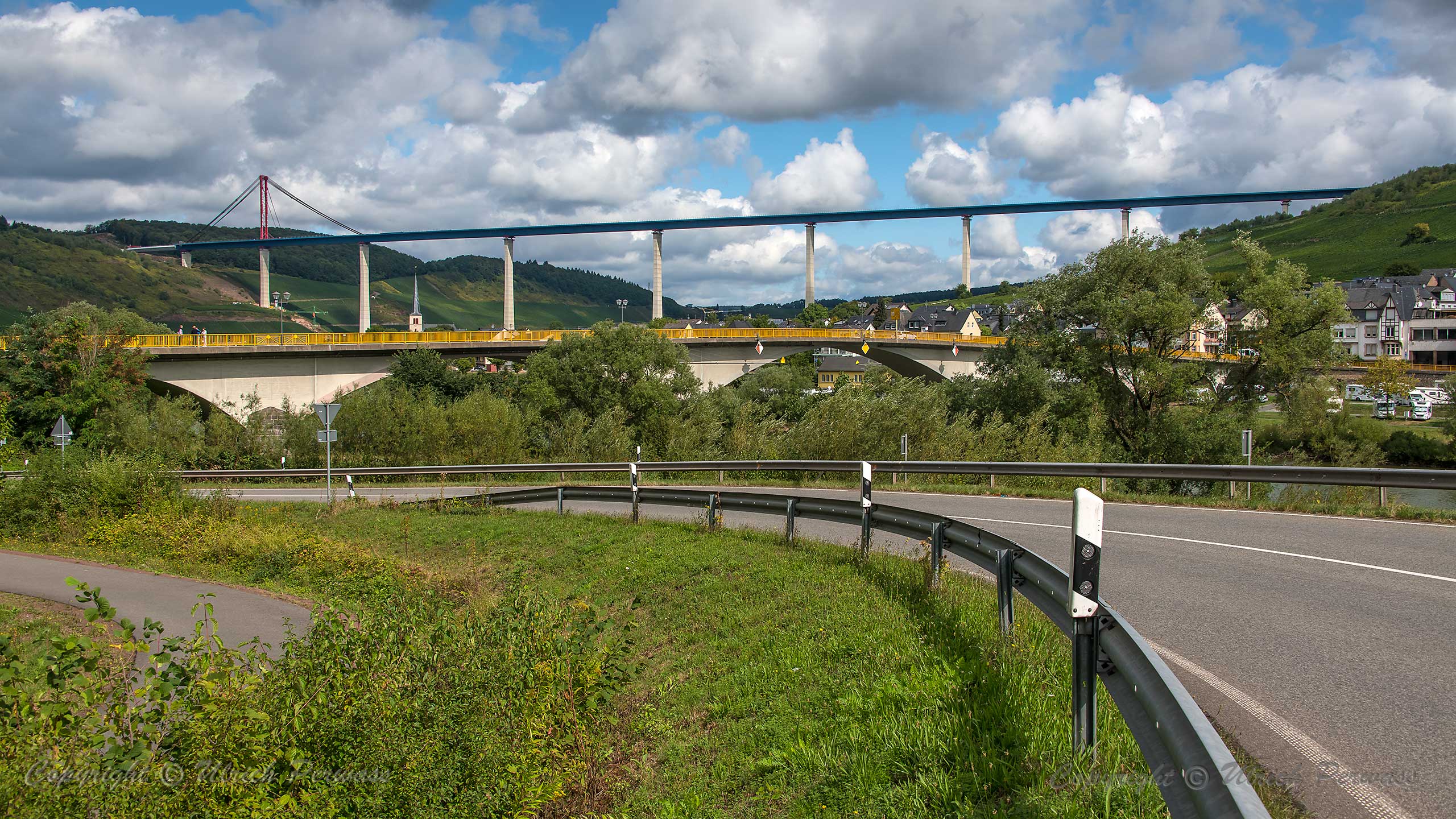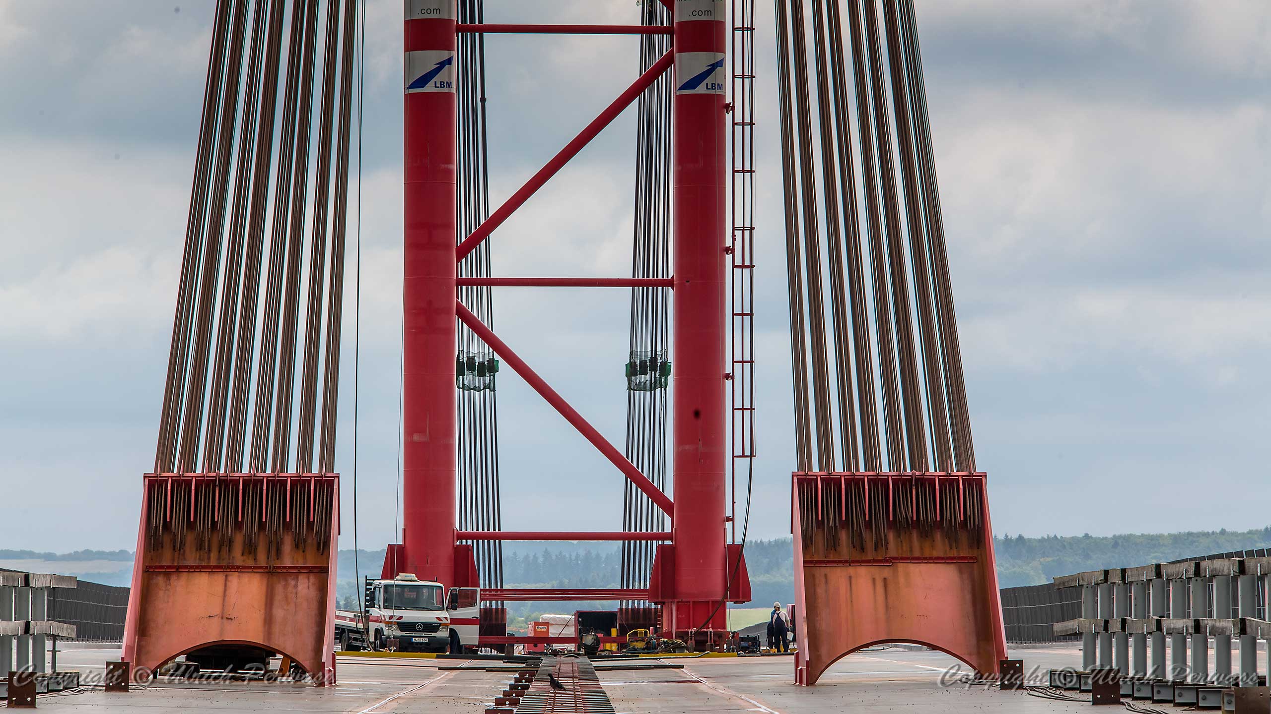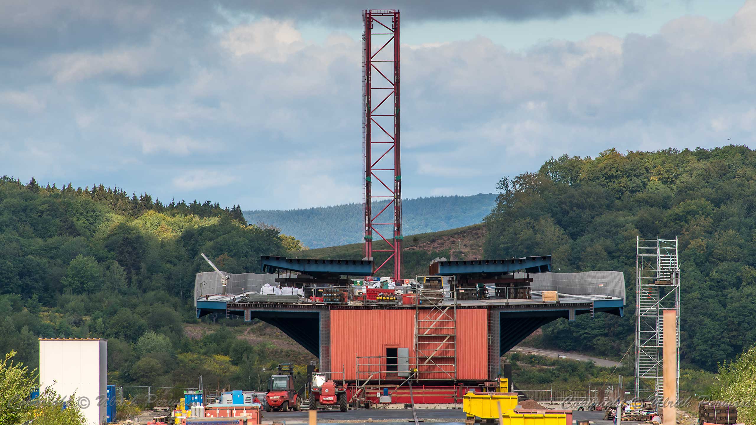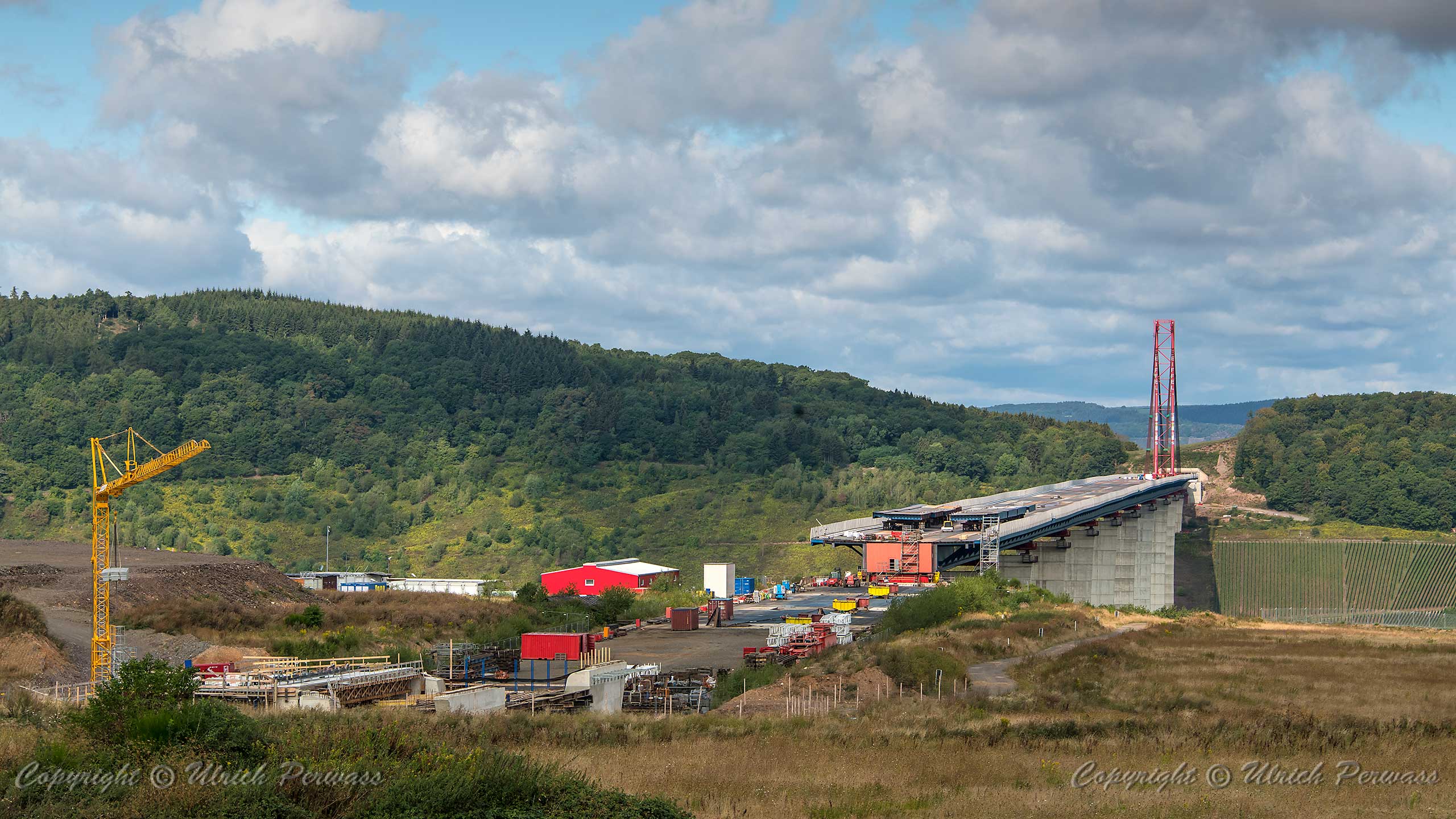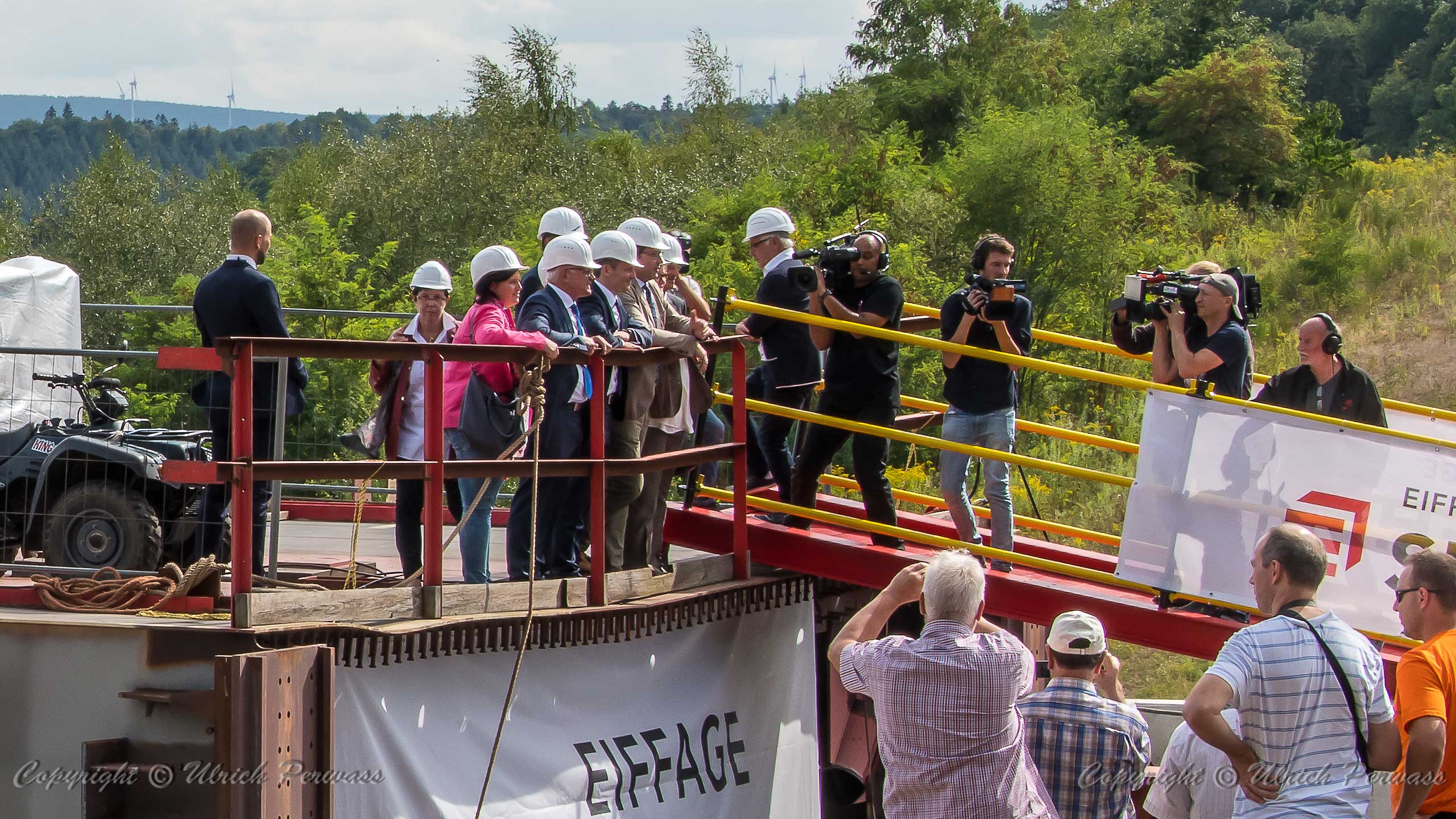 Hochmoselbrücke Finaler Vorschub am 24.08.2018 Gemütlich schaukelte ich am Freitag früh die 175 km von Bensberg nach Ürzig, um den Abschluss meiner jahrelangen Fotosafaris zur Baustelle der Hochmoselbrücke in der wunderschönen Mosellandschaft zu genießen. Ich war der erste Gast um 11 Uhr Morgens, als ich von einem Security-Mann gefragt wurde, ob ich denn zum Demonstrieren gekommen sei. "Nein," war natürlich meine Antwort, "ich suche nur einen Parkplatz." Den fand ich auf der neuen 2,6 km langen B50n beidseitig zur Genüge. Ich war nämlich der allererste Parkplatznutzer, der seinen Wagen etwas schräg stellen sollte, damit die Nachfolger es mir gleich tun würden. Das taten die denn auch, und zwar vierspurig die gesamte 2,6 km lange Strecke bis zum Kreisel Platten. Das Interesse am Rohbauende der Hochmoselbrücke war also gewaltig und verlief äußerst friedlich! Auf halber Höhe fand ich einen guten Platz für mein Stativ und meine NIKON. Sehen Sie hier das Ergebnis: