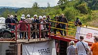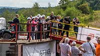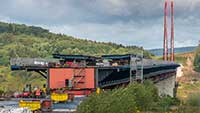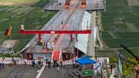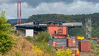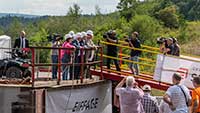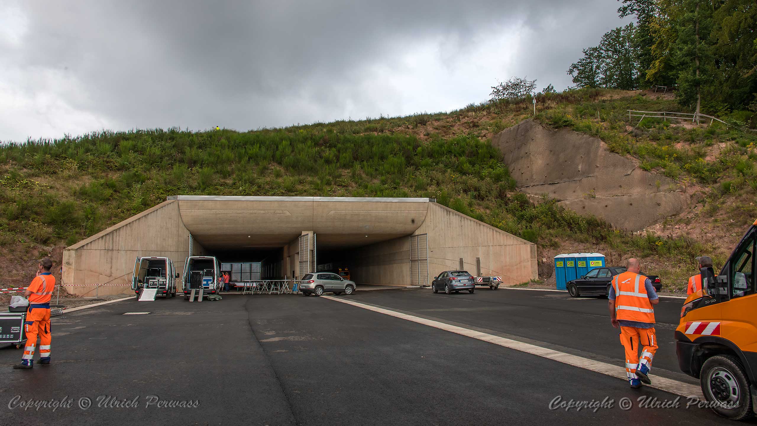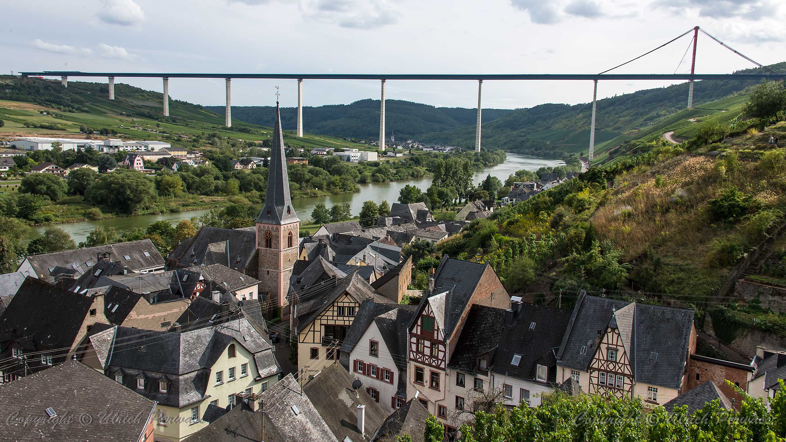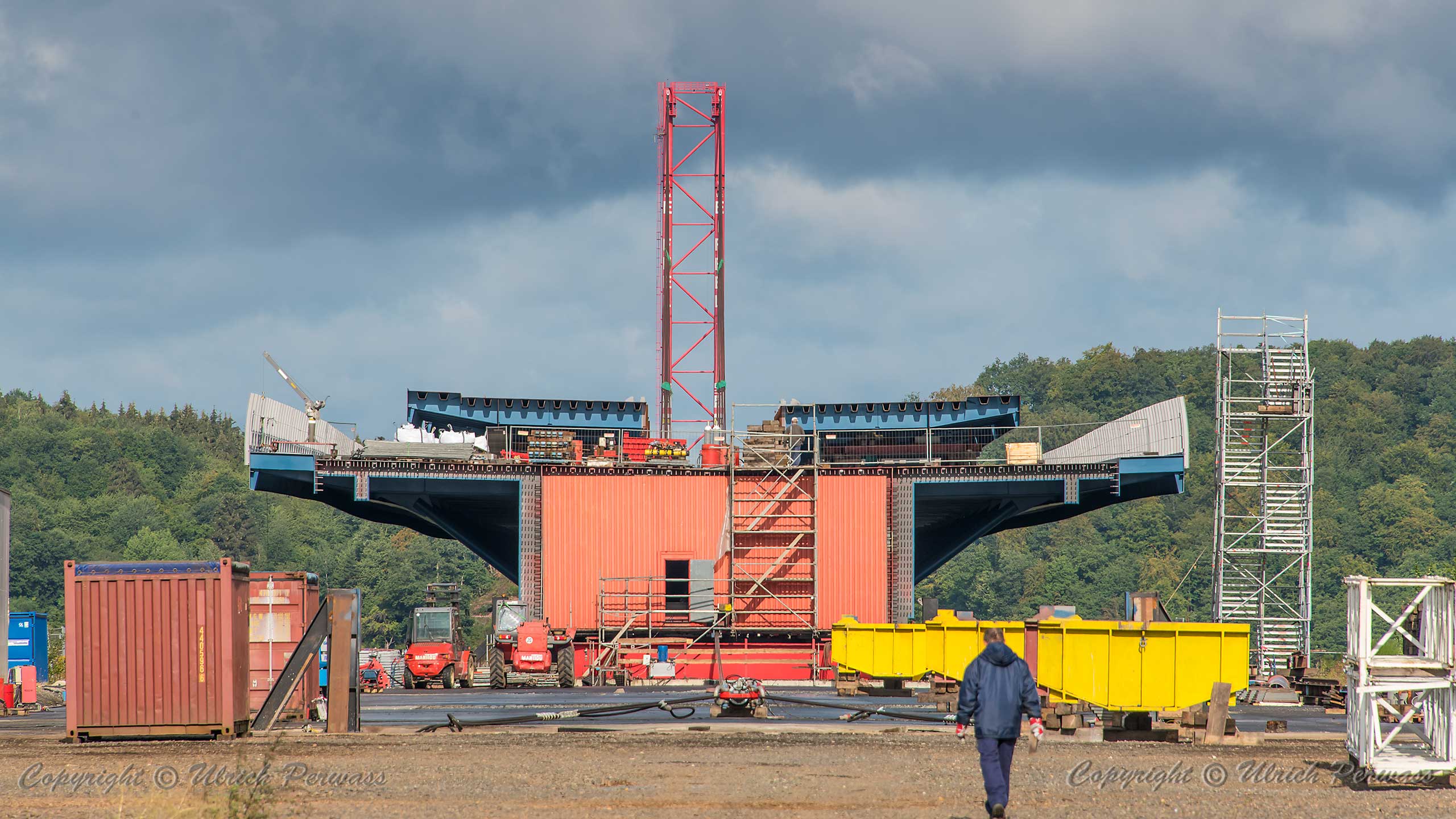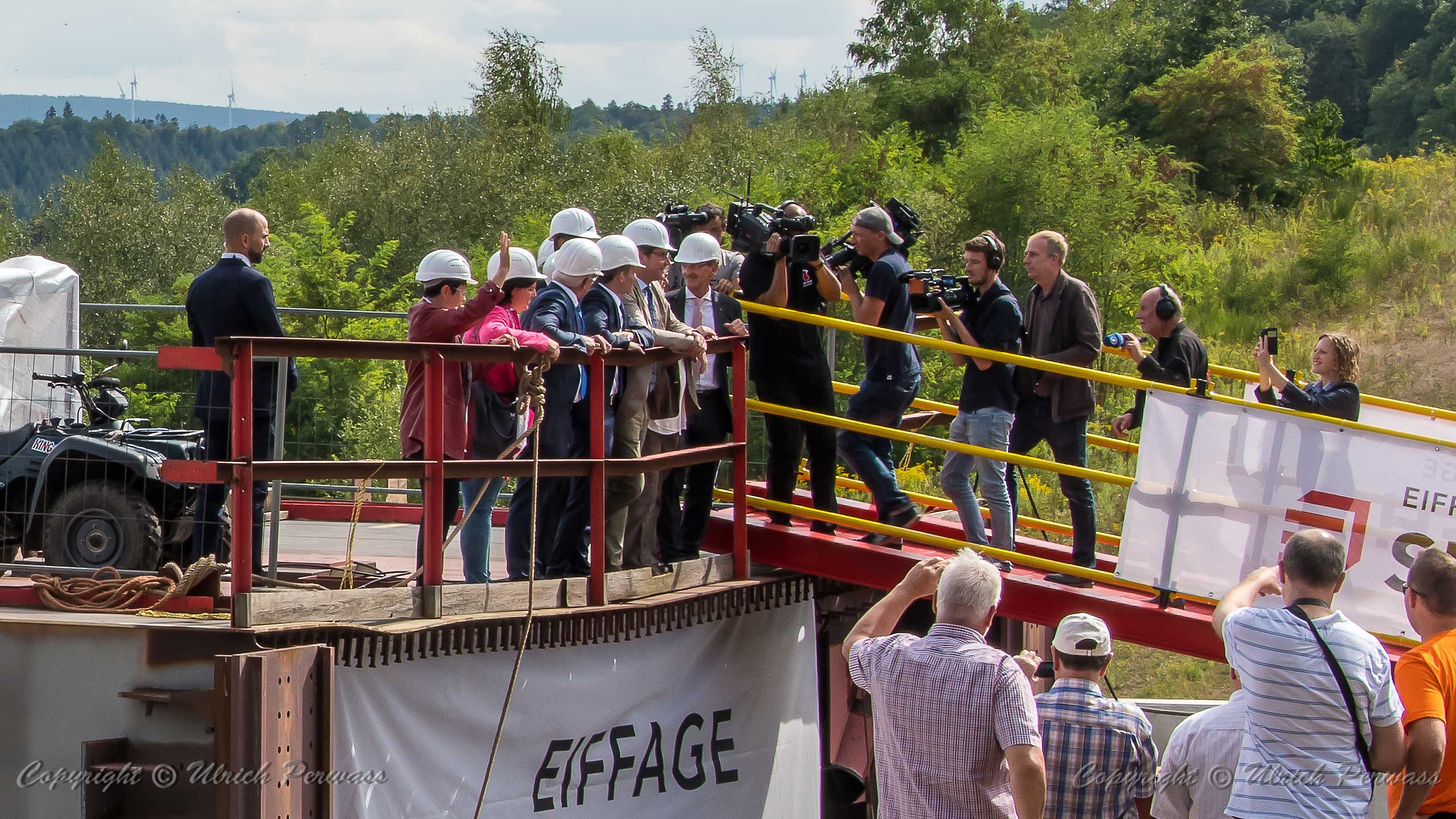 Hochmoselbrücke Finaler Vorschub am 24.08.2018 Gemütlich schaukelte ich am Freitag früh die 175 km von Bensberg nach Ürzig, um den Abschluss meiner jahrelangen Fotosafaris zur Baustelle der Hochmoselbrücke in der wunderschönen Mosellandschaft zu genießen. Ich war der erste Gast um 11 Uhr Morgens, als ich von einem Security-Mann gefragt wurde, ob ich denn zum Demonstrieren gekommen sei. "Nein," war natürlich meine Antwort, "ich suche nur einen Parkplatz." Den fand ich auf der neuen 2,6 km langen B50n beidseitig zur Genüge. Ich war nämlich der allererste Parkplatznutzer, der seinen Wagen etwas schräg stellen sollte, damit die Nachfolger es mir gleich tun würden. Das taten die denn auch, und zwar vierspurig die gesamte 2,6 km lange Strecke bis zum Kreisel Platten. Das Interesse am Rohbauende der Hochmoselbrücke war also gewaltig und verlief äußerst friedlich! Auf halber Höhe fand ich einen guten Platz für mein Stativ und meine NIKON. Sehen Sie hier das Ergebnis: