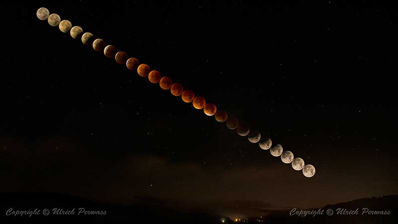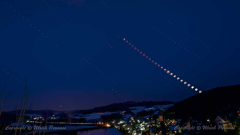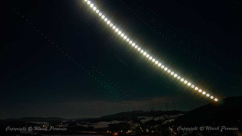 Blutmond am 21. Januar 2019 Das ist er leider nicht! Trotz bester Technik sind alle aktuellen Aufnahmen vom 21.01.2019 bei -15° C (!) wegen Unachtsamkeit und Vereisung des Objektivs dem Schärfeteufel zum Opfer gefallen. Deshalb hier zunächst die Mondspuren vom Vorabend und anschließend vom 21. Januar. Alle 5 Minuten wurde eine Aufnahme gemacht !!! |