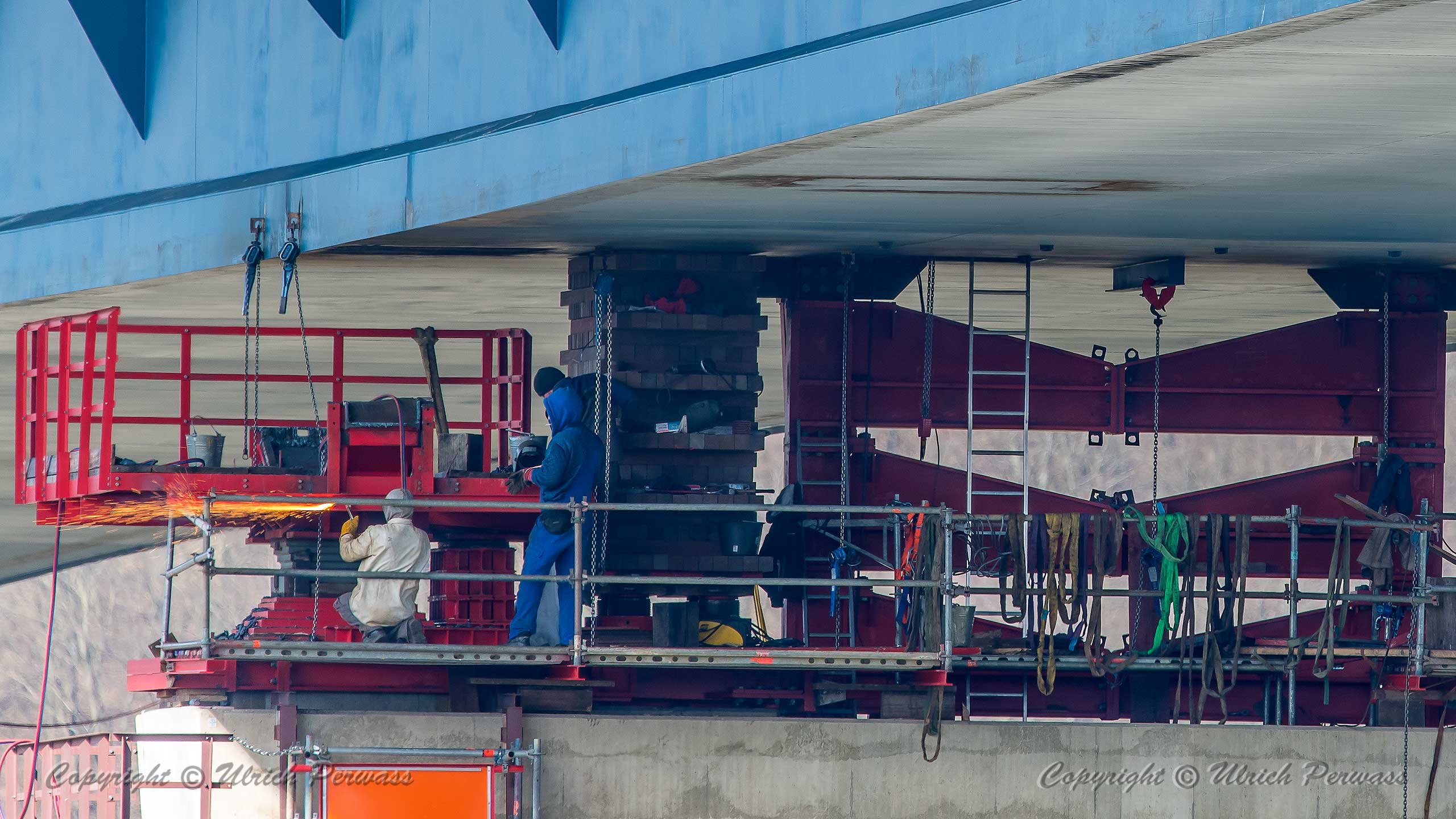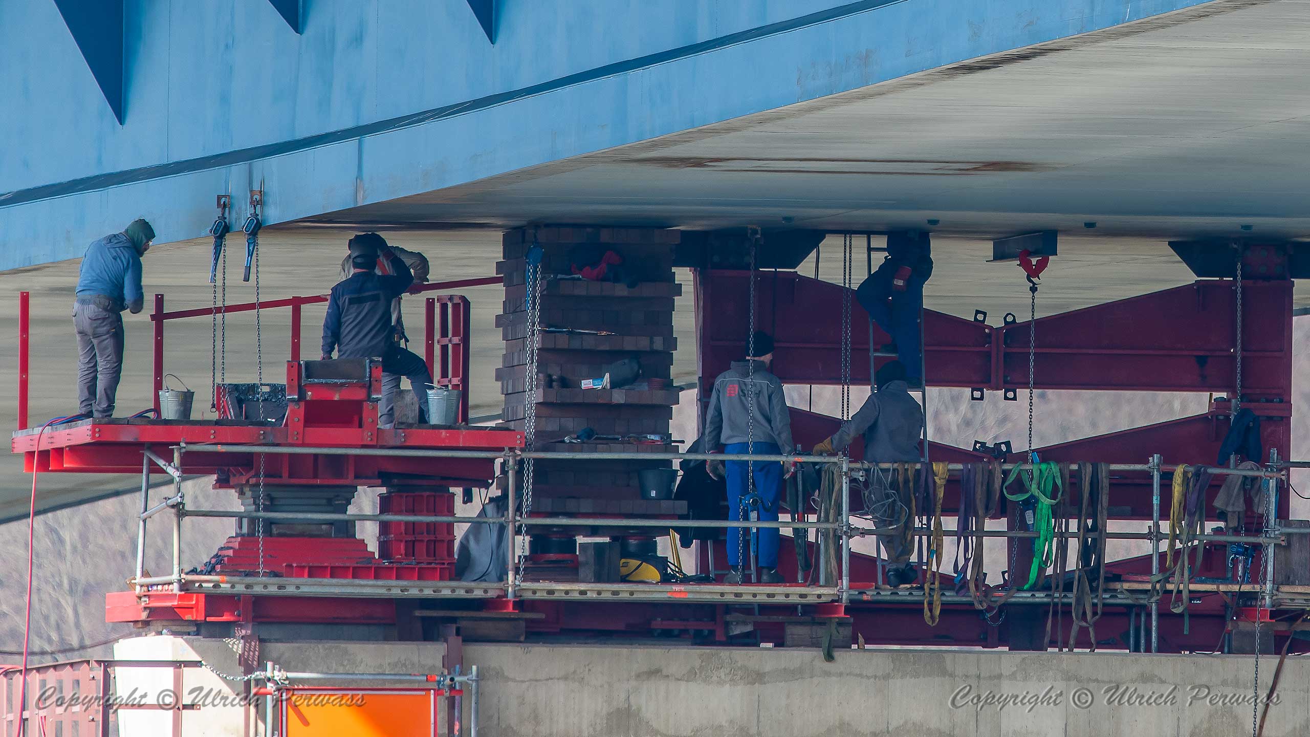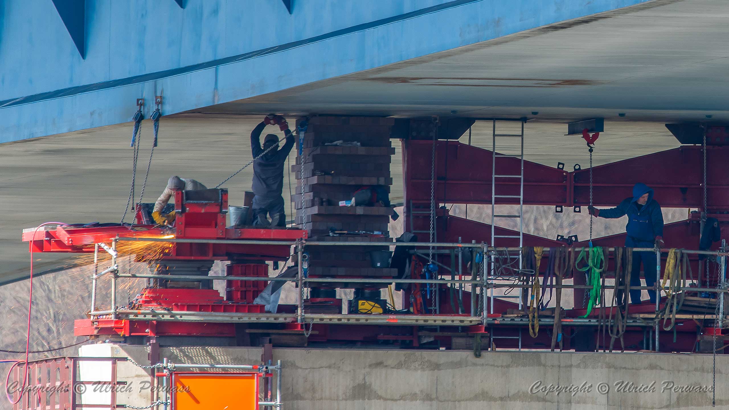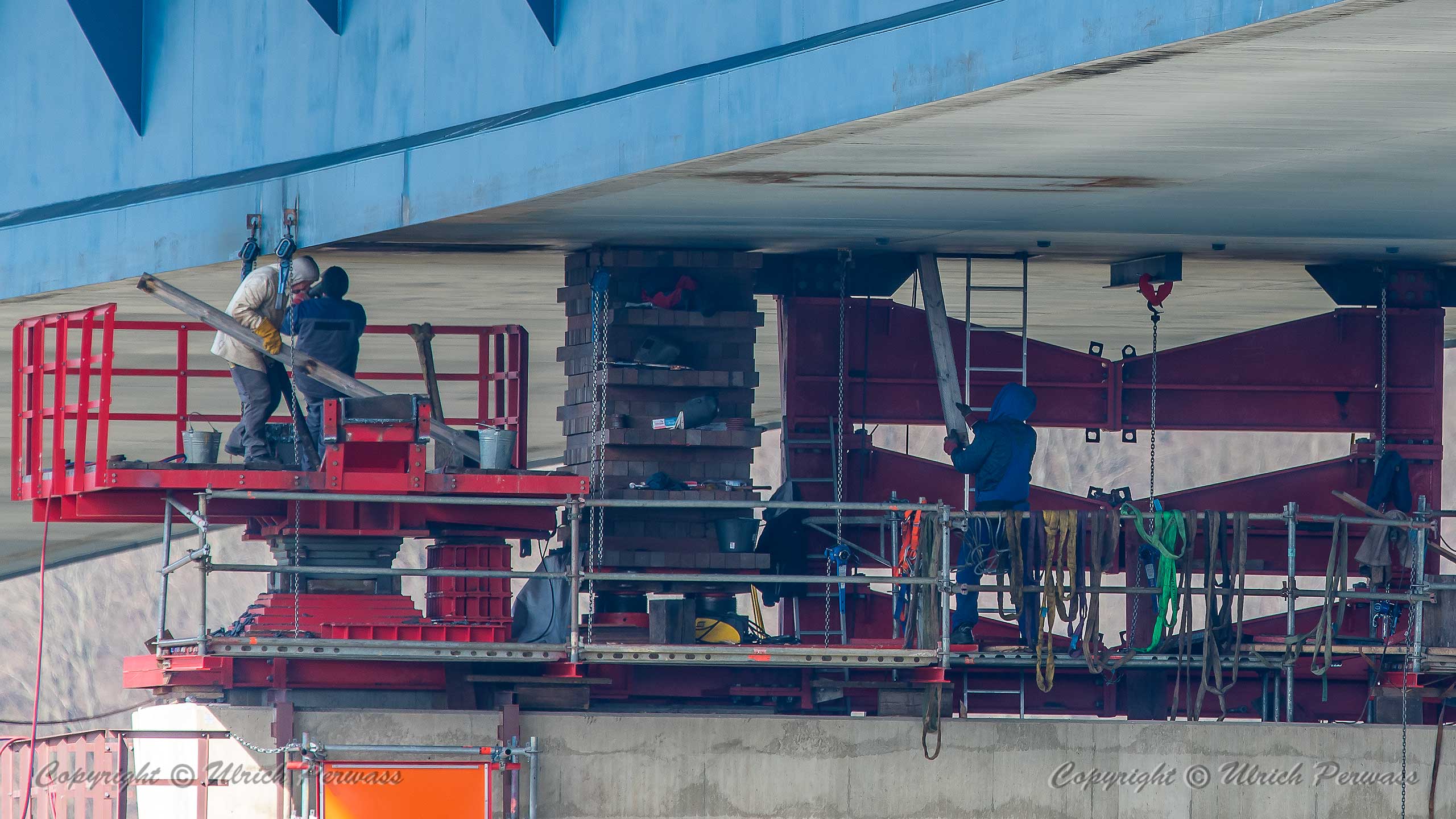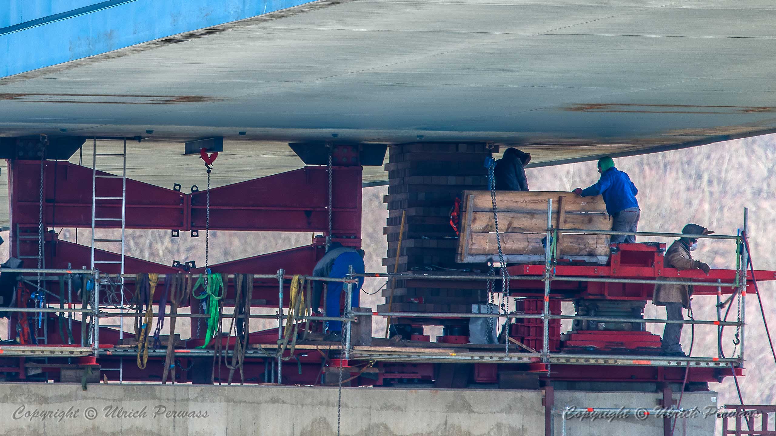 Am Freitag, den 22. März 2019, war ich bei gutem Wetter wieder an der Mosel, um das Absenken des Überbaus am Pfeiler 8 zu fotografieren. Leider waren die Stahlarbeiter noch nicht ganz so weit. Sie zerteilten immer noch die Überreste des Vorschubbalkens in transportierbare Stücke, die daraufhin durch ein Loch hoch in den Brückenkasten gehoben werden mussten, um dort dann abtransportiert zu werden. Eine Knochenarbeit! Alle Achtung! Doch schauen Sie selbst: